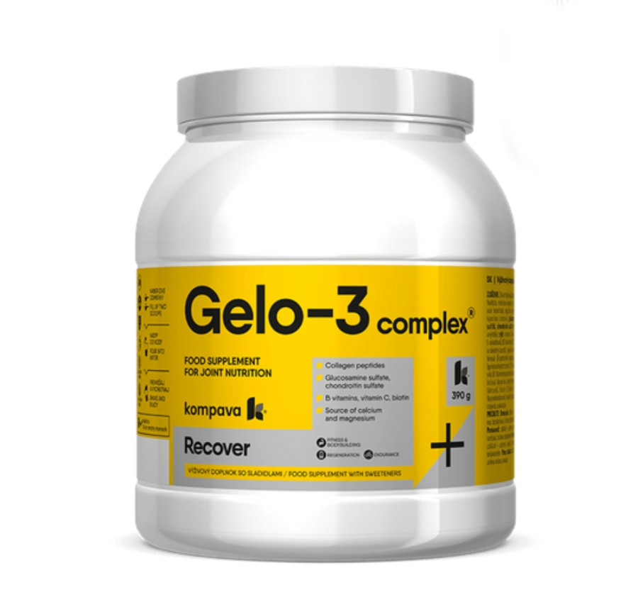 Unikátní složení Gelo-3 complex® zajistí namáhaným kloubům tu nejlepší výživu – obsahuje nejen hydrolyzovaný kolagen, ale také Glukosamin sulfát, Chondroitin sulfát, vitamin C, vápník a hořčík v organické formě a tak komplexně vyživuje pohybový aparát.