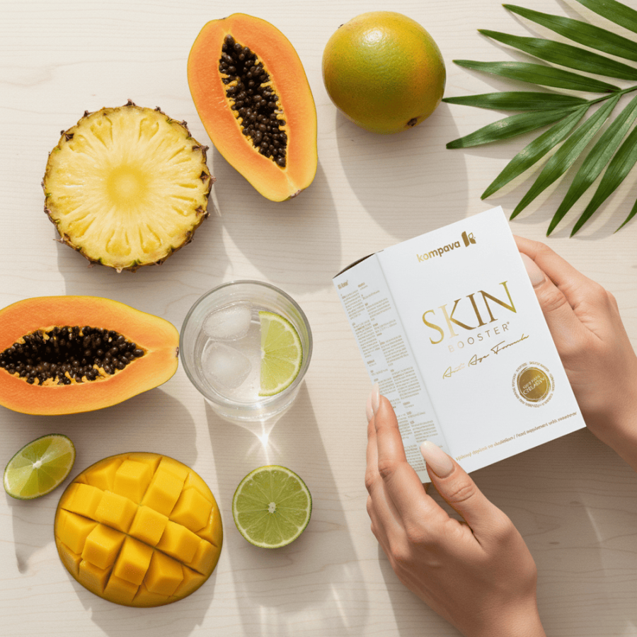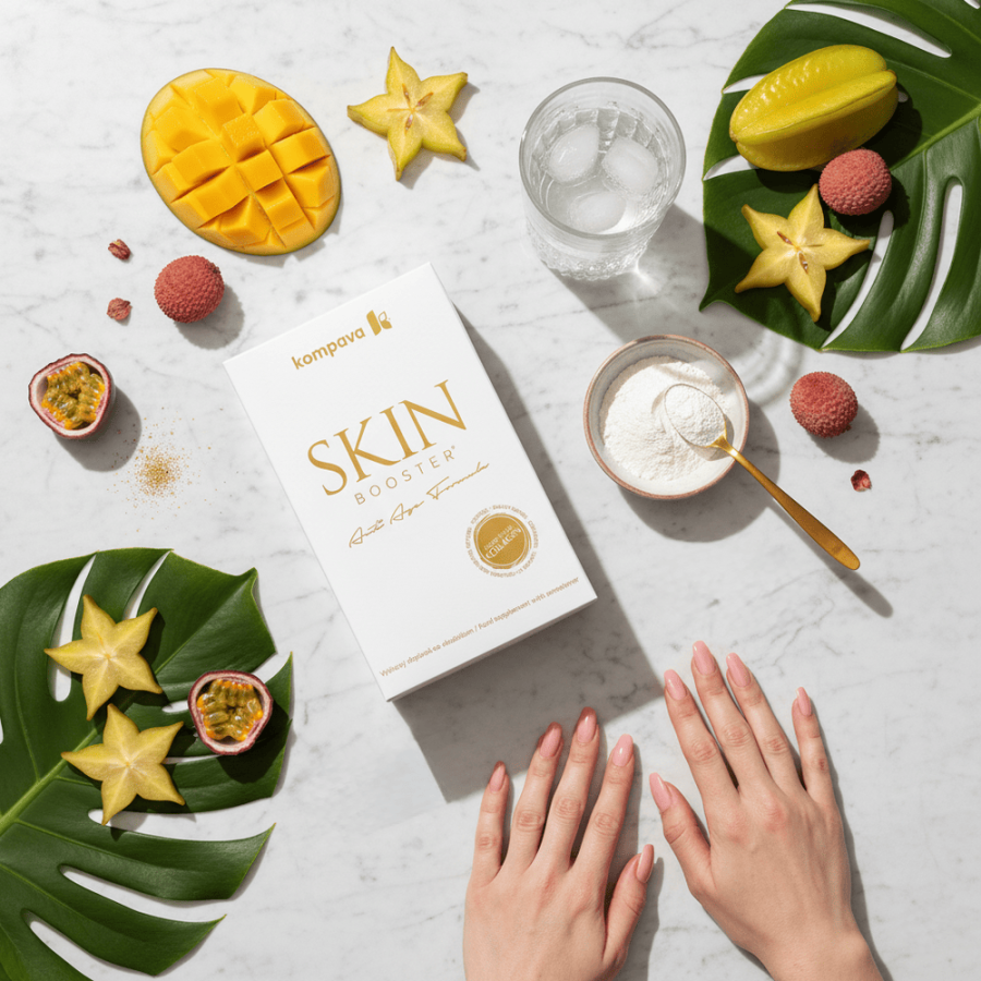 Věkem je stárnutí pleti stále výraznější. Prvními příznaky jsou vznikající vrásky, suchost pokožky, pigmentové skvrny. Proto je důležitá péče o pleť i prostřednictvím správných přípravků. Hlavní roli při procesu stárnutí pokožky má bílkovina kolagen. Kolagenová vlákna tvoří infrastrukturu pro elastin, který zajišťuje elasticitu a pro kyselinu hyaluronovou, která je zodpovědná za hydrataci. Skinbooster® je speciální tím, že neobsahuje pouze samotný kolagen, ale i ostatní velmi důležité složky pro zdravou pleť, vlasy a nehty. Už po užití prvního balení můžete pozorovat vyhlazení pleti a celé pokožky, eliminaci vypadávání vlasů či pevnější nehtySkinBooster v osvěžující příchuti Tropical spojuje šťavnatý ananas, exotickou papaji, sladké mango a svěží limetku do dokonale vyvážené kombinace chutí.