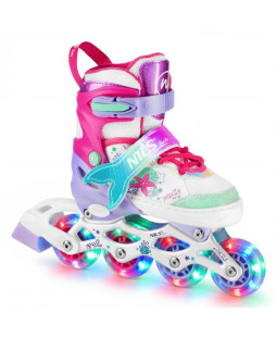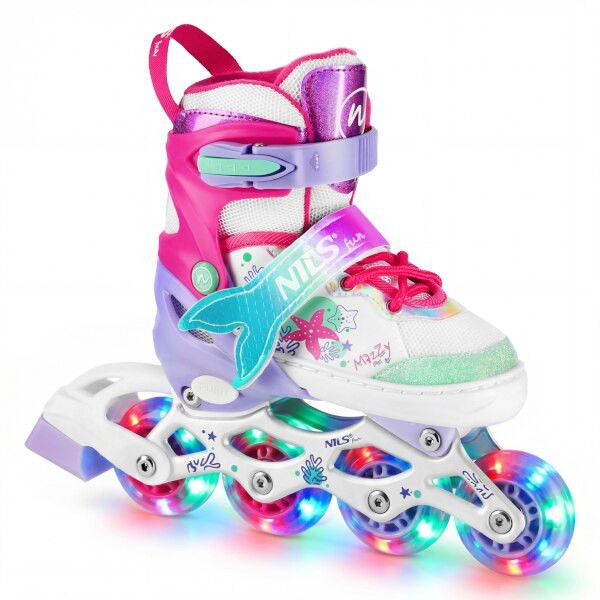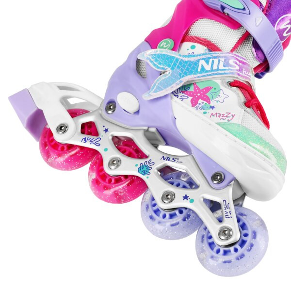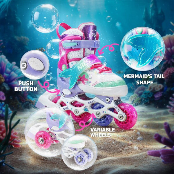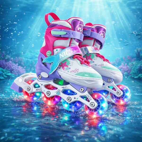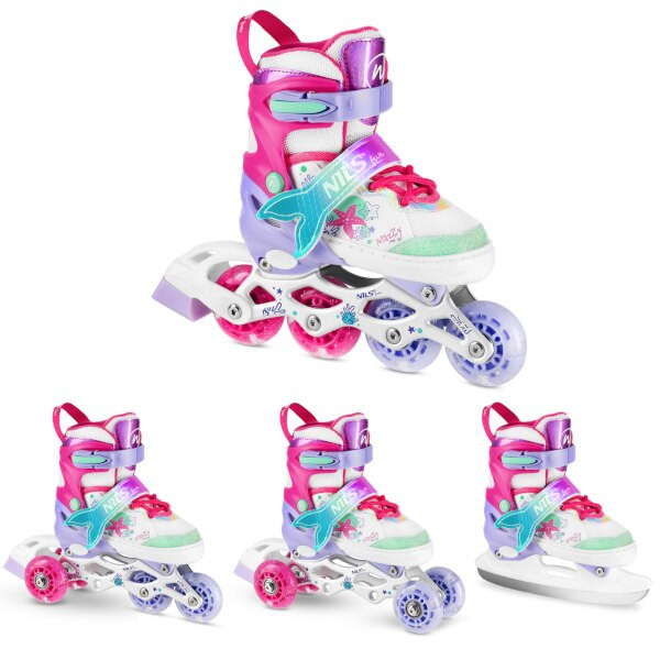 NH18150 MAZZY značky NILS Fun je jedinečný dětský set 4v1, který spojuje funkčnost, bezpečnost a atraktivní pohádkový design inspirovaný podmořským světem. Jeden produkt nabízí hned čtyři konfigurace – kolečkové brusle, lední brusle, quad brusle a 2+1+1 pro začátečníky – a je tak ideální pro celoroční využití.