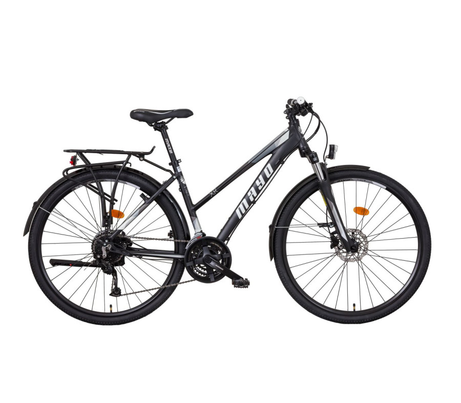 Trekingové dámské jízdní kolo Mayo XR Tour Trek Disc Lady Flat má hliníkový rám AL6061 o velikosti 18" a kola o průmšru 28". Kolo má přední odpruženou vidlici.