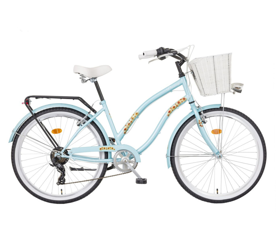 Plážové jízdní kolo Liberty Daisy 6spd. ve stylu CRUISER má ocelový rám velikosti 17" svařený TIG technologií. Kolo má zadní šest převodů v zadu se zadním měničem SHIMANO TOURNEY RDTY300, přední a zadní brzdy SACCON V-BRAKE AL a dvojité hliníkové ráfky M.A.T.E. DWR30.Komfort kola podporují široké 2" pláště obuté na DOUBLEWALL ráfcích. Výbava kola je rozšířena o přední košík, nosič, blatníky a batériové LED osvětlení.