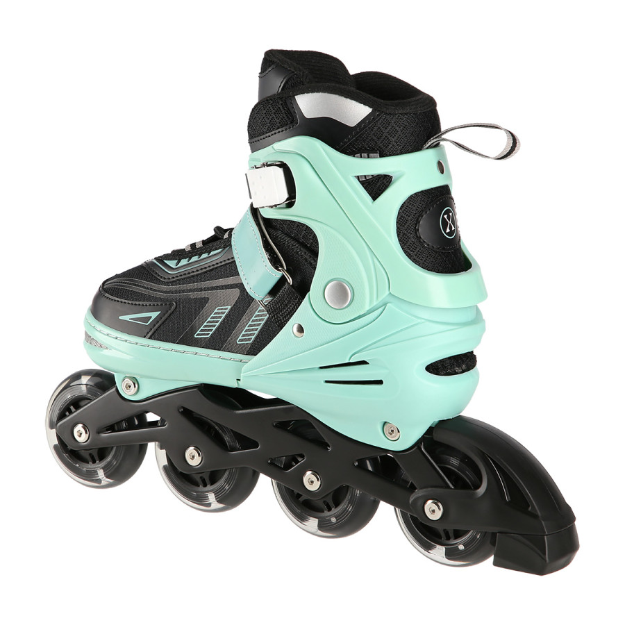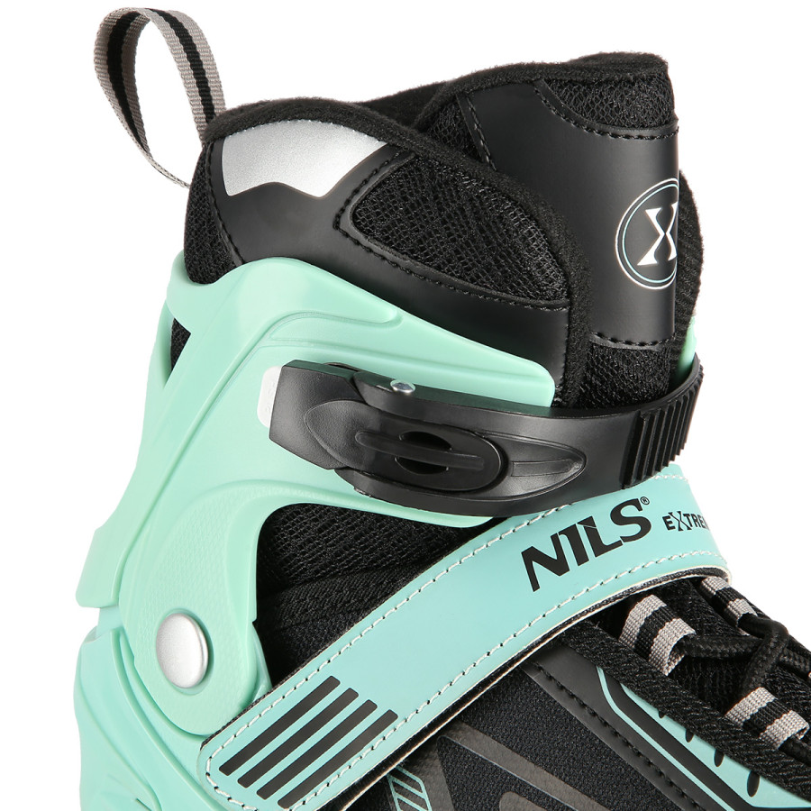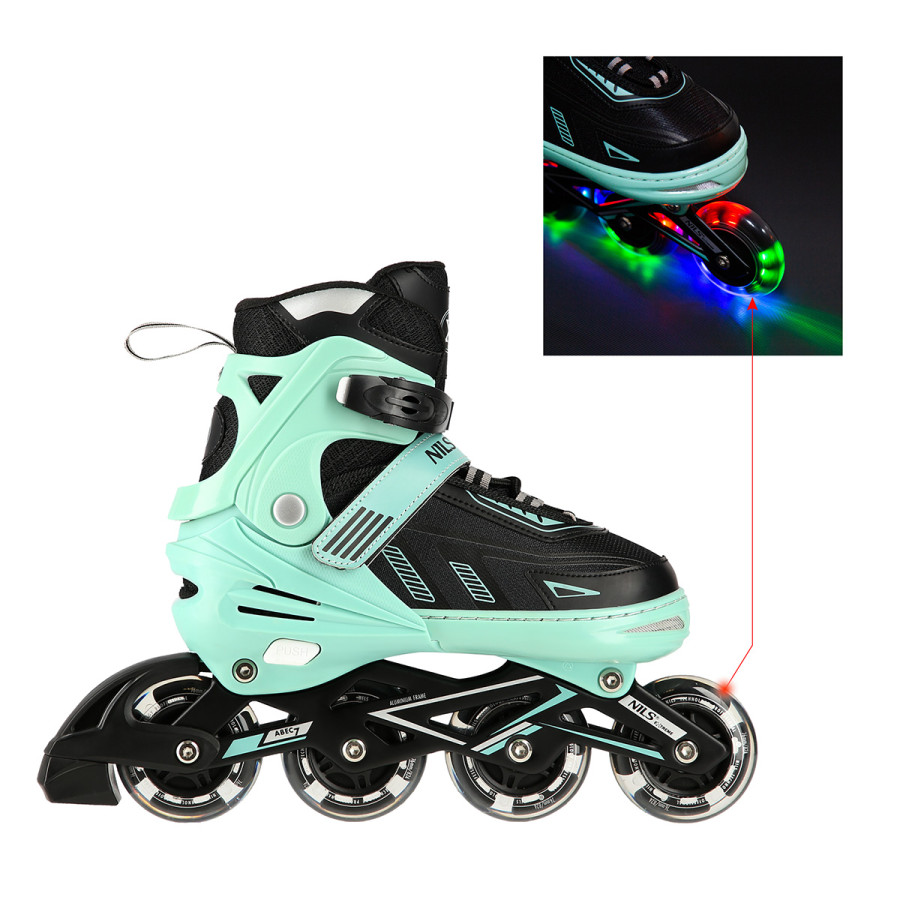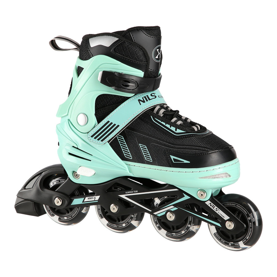Kolečkové brusle NILS Extreme NA11230 jsou určeny k rekreační jízdě začínajících a středně pokročilých bruslařů. Lehká a odolná bota zajišťuje bezpečnost při jízdě. Systém ventilace a tvarovaná stélka boty přímo ovlivňují zvýšení uživatelského komfortu. Jedná se o model s nastavitelnou velikostí, kdy každá brusle má na výběr ze 4 rozměrů (rozměr XL do tří velikostí). Pomocí stisku tlačítka a posunutí špičky lze snadno a rychle nastavit velikost boty na noze uživatele. Kolečka s tvrdostí 82A jsou uložena v hliníkové liště, dobře přiléhají k podkladu a částečně pohlcují nervnosti. Uvnitř koleček jsou LED diody, které při jízdě svítí. Model NA11230 je osazen ložisky ABEC 7, která se vyznačují precizním zpracováním a nízkým odporem, kdy jízda má dobrou setrvačnost a na bruslích tak lze urazit dlouhou vzdálenost bez vynaložení zbytečné síly. Zapínání brusle je řešeno klasickou trojkombinací - dvousekční přezka, řemínek se suchým zipem, šněrování. Pravá brusle je osazena brzdou.