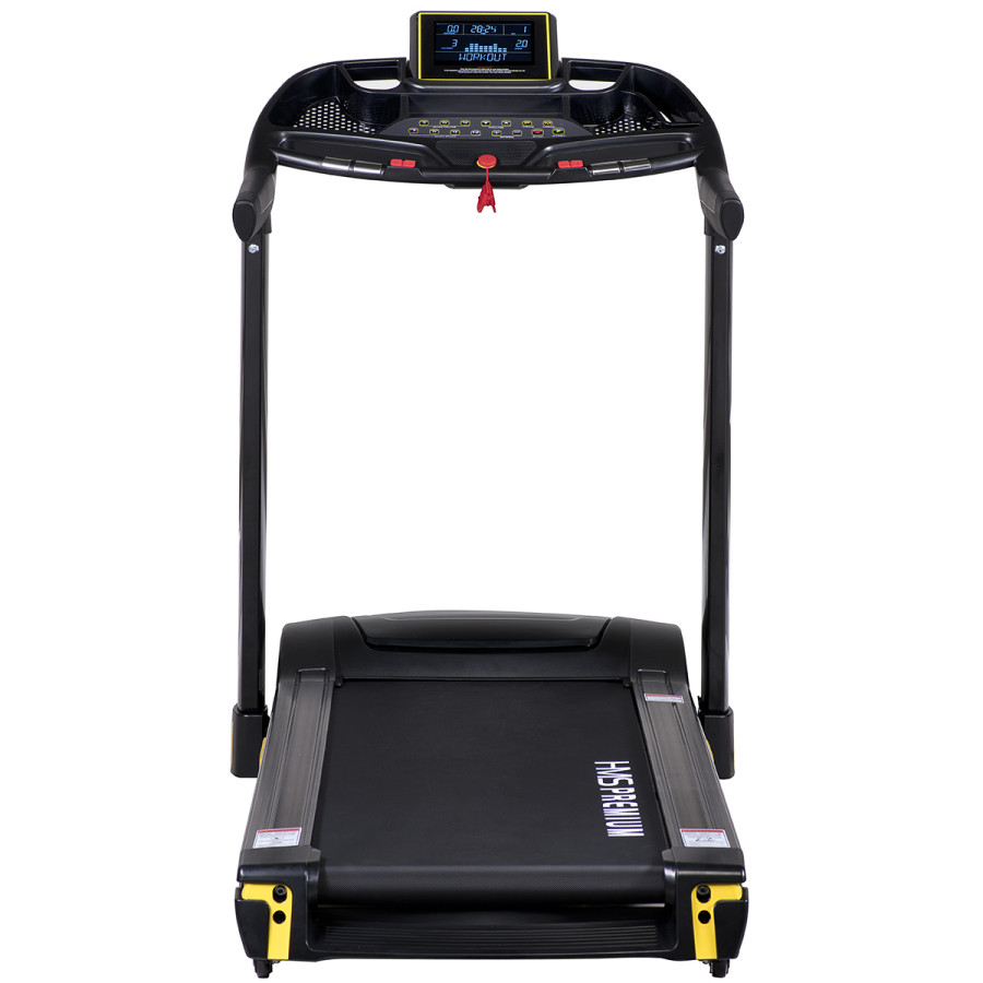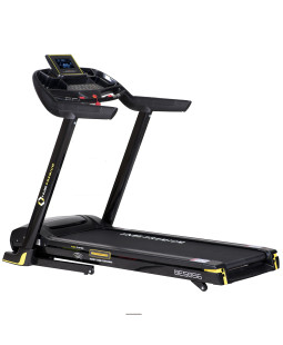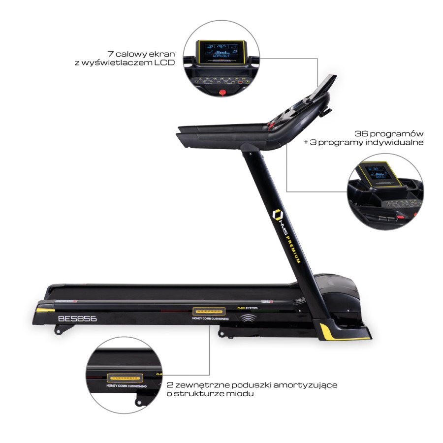 Trenažér HMS BE5856 je běžecký pás určený pro domácí použití. Veliká běžecká plocha o rozměrech 48 x 141 cm je umístěná na konstrukci, která je od hlavního rámu odpružená pomocí vnitřního "polštáře" a dvou vnějších tlumičů, ty jsou vyrobeny z gumy tvaru včelích pláství. Funkční systém odpružení zajišťuje pohodlí během tréninku a výrazně snižuje zatěžování kloubů. Rychlost běhounu je plynule nastavitelná v rozsahu 1 - 18 km/h. Pás BE5856 je tak vhodný jak pro úplné začátečníky, tak pro pokročilé běžce. Pro opravdu náročný trénink je trenažér vybaven elektronickou regulací náklonu v rozsahu 0 - 15° a lze jej plynule nastavit pomocí tlačítek na ovládacím panelu. Ovládací konzole je vybavena 2-mi madly pro rychlý úchop, 2-mi madly s elektrodami pro snímání tepové frekvence, prostorem pro odložení láhve, stojánkem pro mobilní telefon nebo tablet, klávesnicí a monitorem. Klávesnice je vybavena tlačítky Start, Stop, Program, Mode. Dále se zde nachází ltačítka pro plynulou změnu rychlosti a skokovou změnu rychlosti na 3, 6, 9, nebo 12 km/h a o řadu výše se nachází tlačítka pro plynulou změnu úhlu běžecké plochy a tlačítka pro skokovou změnu úhlu na 3, 6, nebo 9°. Počítač trenažéru BE5856 je vybaven 7" monitorem, který zobrazuje veškeré informace (čas tréninku, rychlost, úhel, vzdálenost, spálené kalorie a tepovou frekvenci). Počítač také dokáže zobrazit procento tělesného tuku. Pro trénink je k dispozici 36 pevných a 3 uživatelsky definované programy. Běžeckou plochu trenažéru je možné zvednout a ušetřit tak drahocené místo, když zrovna netrénujete.