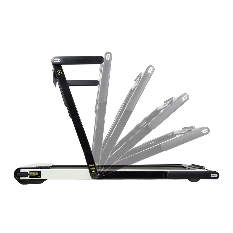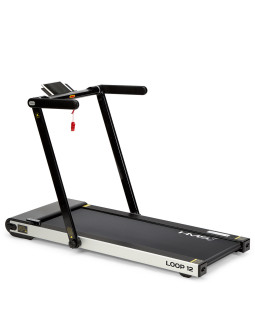 Maximální rychlost trenažéru je 12 km/h, motor má špičkový výkon 2,5 HP. Běžecká plocha o rozměrech 125 x 45 cm je na 6 místech odpružena pomocí silikagelových silentbloků, které snižují zatěžování kloubů při běhu. Konzole jde snadno sklopit k zadní hraně trenažéru a po sklopení získáme rozměr 158 x 77 x 14 cm a trenažér se tak vejde za skříň, nebo pod postel. Přesouvání modelu LOOP12 navíc ulehčují 2 páry koleček. První pár se nachází na spodní hraně a po zvednutí zadní části pásu umožňují pohyb vpřed a vzad. Druhý pár koleček se nachází na čele trenažéru a po jeho zvednutí do svislé polohy umožňují pohyb do stran.