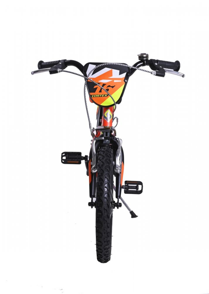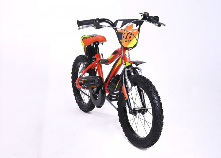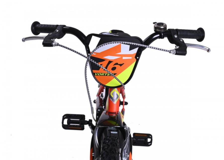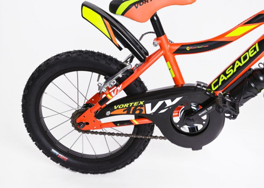Dětské kolo Casadei Vortex Arancio matte 16 je nádherné chlapecké kolo typu BMX, které vykouzlí úsměv na tváři každého malého závodníka. Kolo má 16palcová nafukovací kola s kovovými ráfky a kvalitními plášti. Kolo je určeno pro děti s výškou výškou postavy od 105 cm. Kolo má kvalitní ocelový rám a nádherný lak, který okamžitě získá pozornost všech kolemjdoucích. Na řídítkách najdete ergonomické protiskluzové rukojeti, zvonek a dvě ruční páčkové brzdy, jejichž velikost je přizpůsobena pro malé dětské ruce. Pohodlné polstrované sedlo je výškově nastavitelné. Díky částečně uzavřenému krytu řetězu si děti nezašpiní kalhoty a nehrozí zachycení oděvu do ozubeného kola. Součástí balení je držák s láhví na pití, které ocení každá malá cyklistka. Děti potěší také praktický stojan, díky kterému nemusí kolo pokládat na zem. Součástí kola je také praktický košík pro převážení nejrůznějších věcí a box vzadu za sedlem (Pozor, na fotografii produktu je zobrazena sedačka pro panenky, ale kolo je dodáváno s plastovým úložným boxem místo sedačky). Kolo obdržíte v přepravním kartonu, kdy kolo je již z výroby z 95 % předem smontováno. Po vybalení z kartonu stačí provést tyto jednoduché kroky, které vám nezaberou více než 30 minut: narovnání řídítek, montáž pedálů a doplňků ke kolu.
