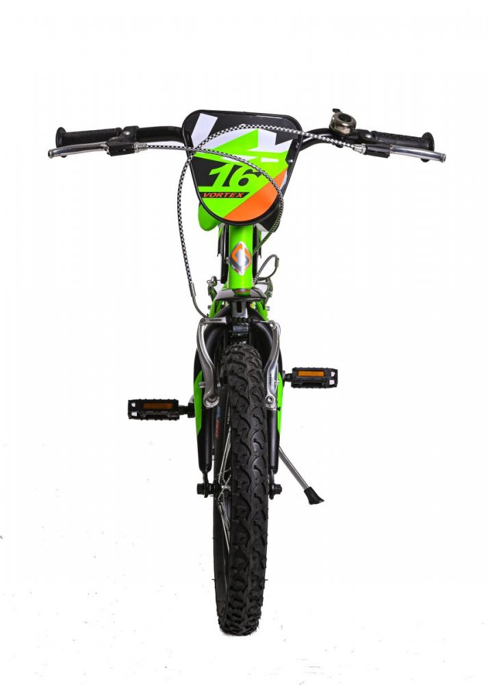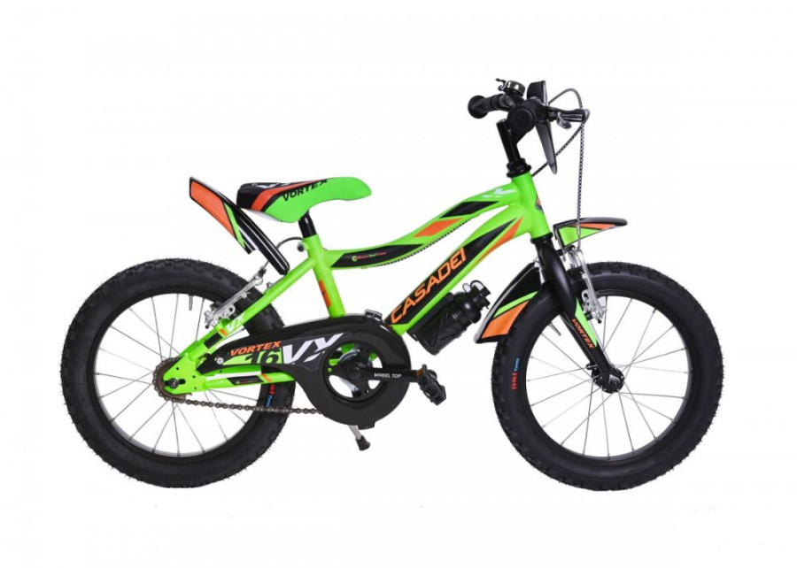 Dětské kolo Casadei Vortex Verde matte 16 je nádherné chlapecké kolo typu BMX, které vykouzlí úsměv na tváři každého malého závodníka. Kolo má 16palcová nafukovací kola s kovovými ráfky a kvalitními plášti. Kolo je určeno pro děti s výškou výškou postavy od 105 cm. Kolo má kvalitní ocelový rám a nádherný lak, který okamžitě získá pozornost všech kolemjdoucích. Na řídítkách najdete ergonomické protiskluzové rukojeti, zvonek a dvě ruční páčkové brzdy, jejichž velikost je přizpůsobena pro malé dětské ruce. Pohodlné polstrované sedlo je výškově nastavitelné. Díky částečně uzavřenému krytu řetězu si děti nezašpiní kalhoty a nehrozí zachycení oděvu do ozubeného kola. Součástí balení je držák s láhví na pití, které ocení každá malá cyklistka. Děti potěší také praktický stojan, díky kterému nemusí kolo pokládat na zem. Součástí kola je také praktický košík pro převážení nejrůznějších věcí a box vzadu za sedlem (Pozor, na fotografii produktu je zobrazena sedačka pro panenky, ale kolo je dodáváno s plastovým úložným boxem místo sedačky). Kolo obdržíte v přepravním kartonu, kdy kolo je již z výroby z 95 % předem smontováno. Po vybalení z kartonu stačí provést tyto jednoduché kroky, které vám nezaberou více než 30 minut: narovnání řídítek, montáž pedálů a doplňků ke kolu.
