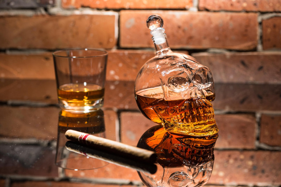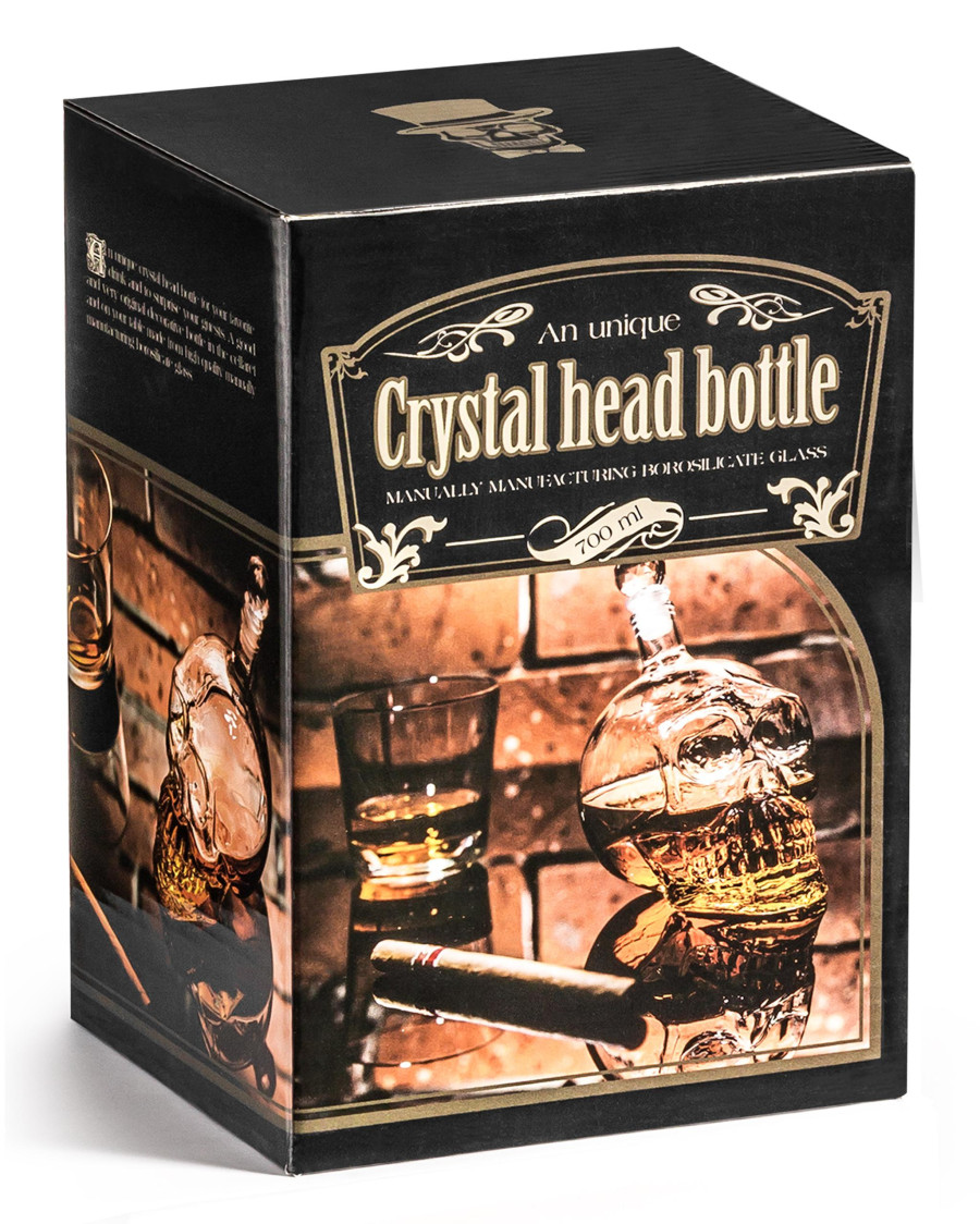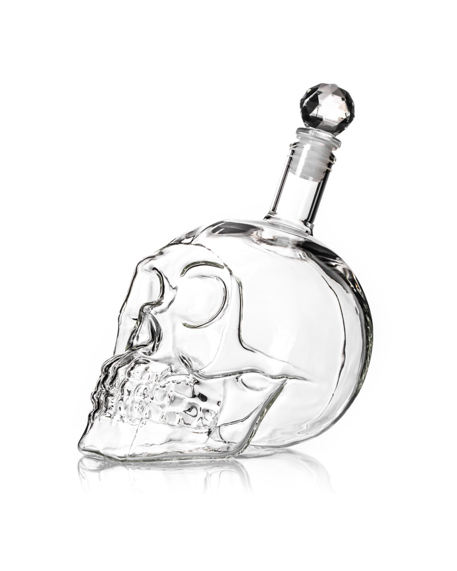 Skleněná láhev ve tvaru lebky s asi bude šokovat vaše přátele když jim nalijte jejich oblíbené pití do této originální a stylové karafy.