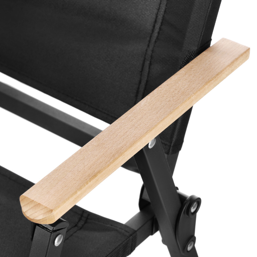 Dřevěné područky dodávají křeslu stylový vzhled a zajišťují, že se skvěle hodí jak do zahrady, tak i do karavanu. Konstrukce je postavena na pevném železném rámu s povrchovou úpravou práškovým lakováním, která zvyšuje odolnost proti každodennímu používání a pomáhá zachovat estetický vzhled po delší dobu.