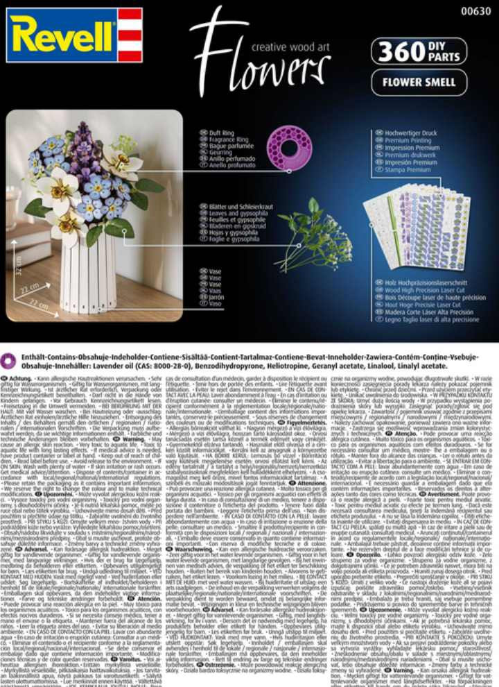 Trend „botanické stavby“ – tedy replikace rostlin z odolných materiálů – se těší celosvětově rostoucí oblibě. Je to moderní interpretace zátiší. Revell jde ještě o krok dále a spoléhá na přírodní materiál dřevo, který kombinuje udržitelnost a estetiku. Kombinace vizuální krásy a čichové přitažlivosti prostřednictvím vonného kroužku dělá z této sady inovaci v oblasti kreativního interiérového designu. Určeno pro osoby starší 14 let.
