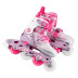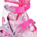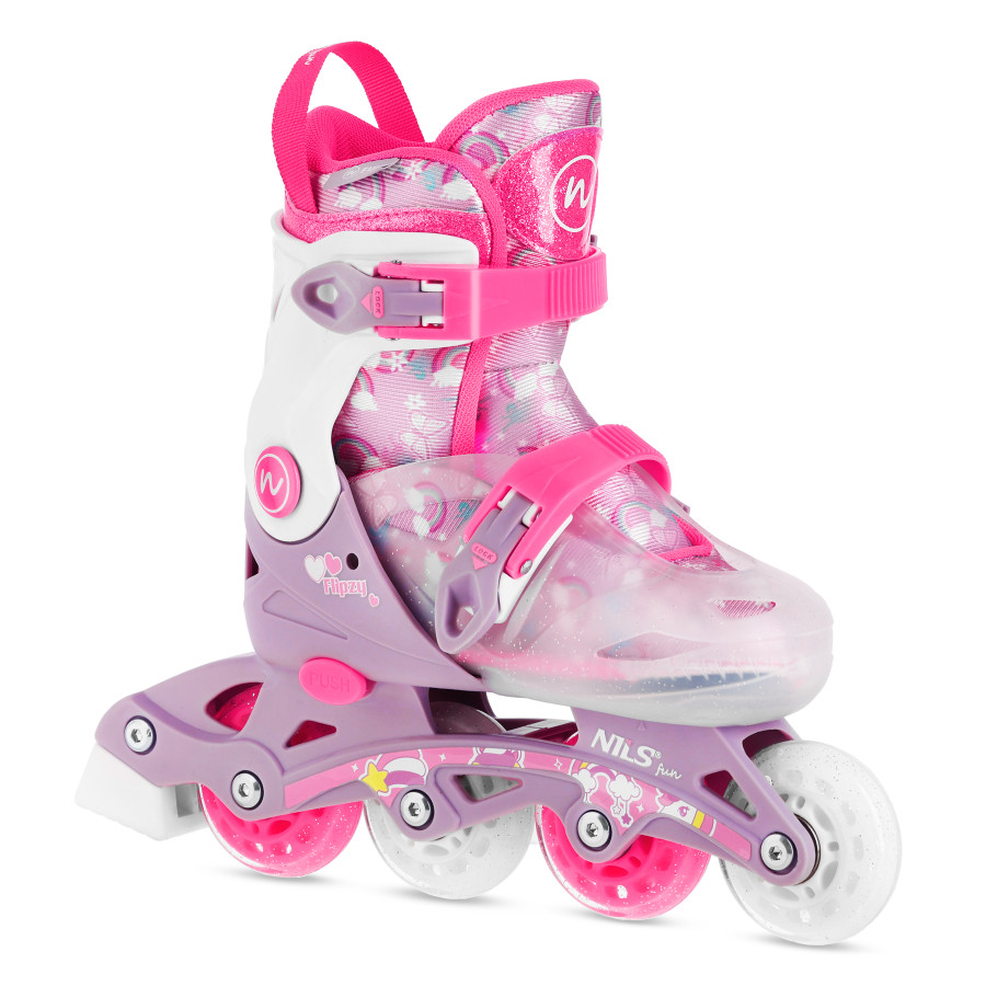 NJ1025 FLIPZY NILS Fun jsou nastavitelné inline brusle navržené pro menší děti, které s bruslením teprve začínají. Pastelové odstíny růžové a fialové, třpytivé akcenty a jemná pohádková grafika včetně motivu motýlků dodávají modelu lehký, dívčí vzhled – ideální pro první bruslařská dobrodružství.