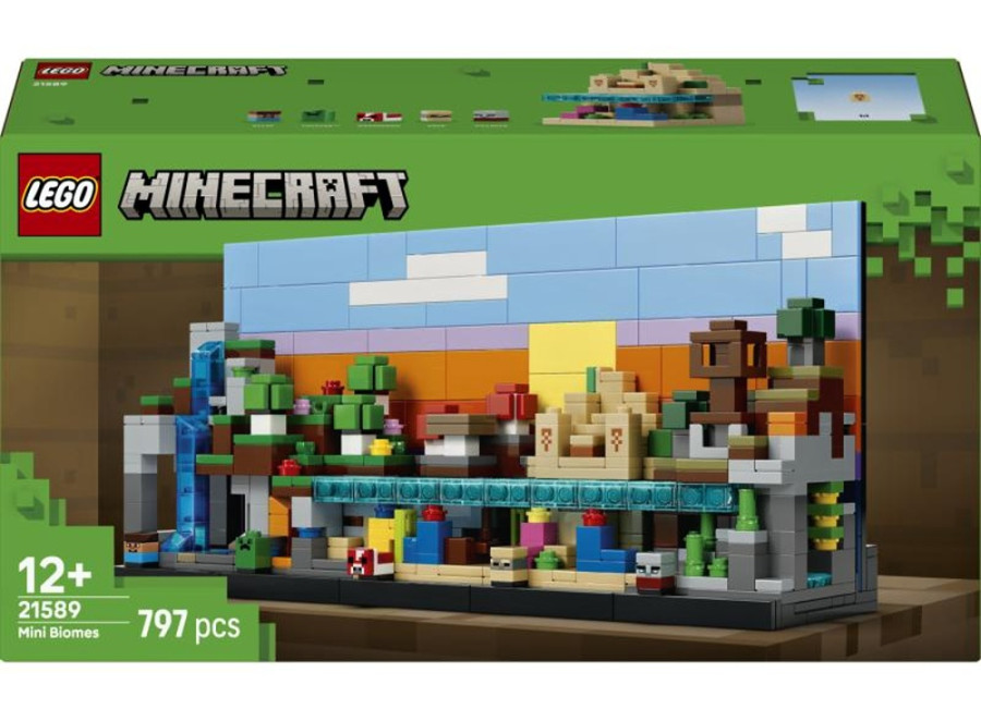 Dekorační stavebnice LEGO® Minecraft Mini biomy přináší pět odnímatelných biomev a 5 microfigurek (Steve, Creeper, mooshroom, husk, pillager) v jedné sadě o 797 dílcích. Hotový model měří 24 × 7 × 11 cm, obsahuje reverzní den/noční pozadí a podporu v aplikaci s 3D návodem, takže poslouží jako precizní herní dekorace i hravý projekt na víkend.