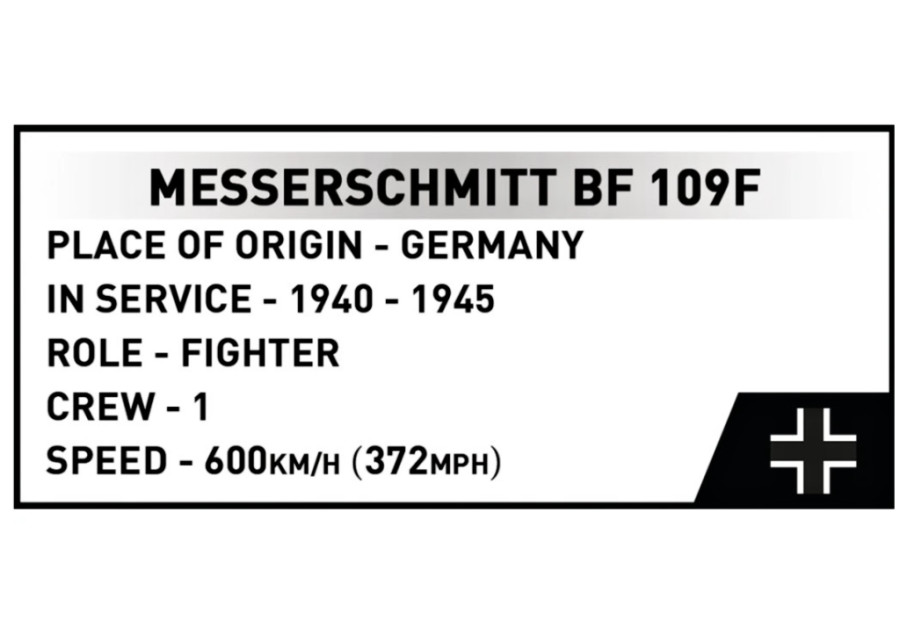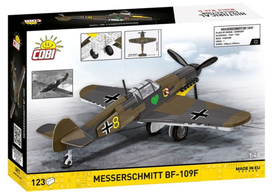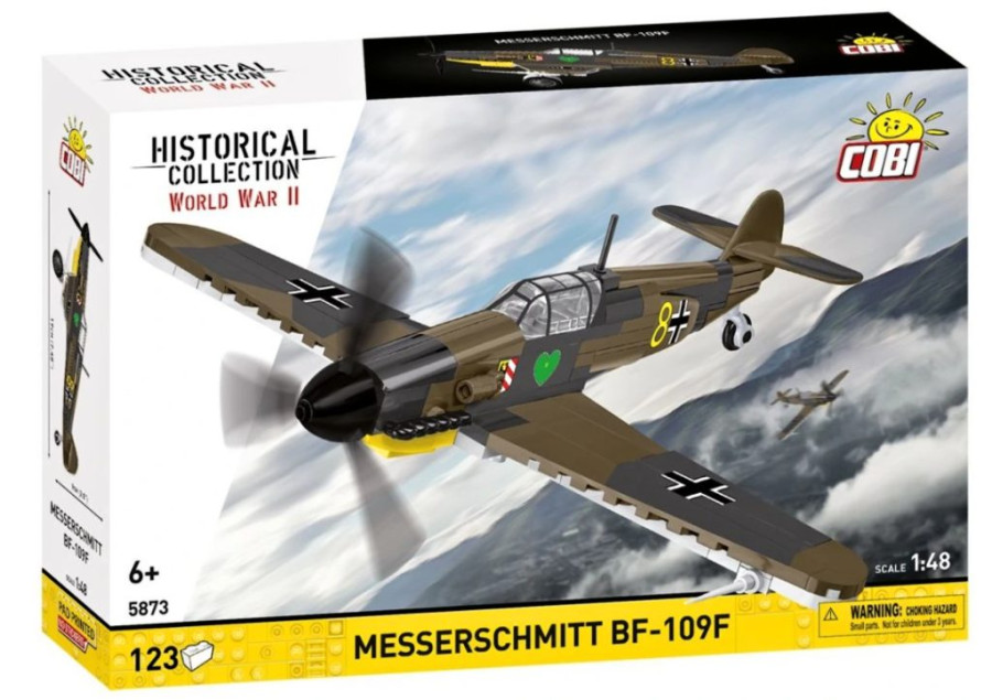 Postavte si model Messerschmitt Bf-109F z 2. světové války. Model je v měřítku 1:48 a měří 19 x 9 cm a rozpětí křídel má 21 cm. Má mnoho funkčních částí. Balení obsahuje 123 kostek stavebnice.