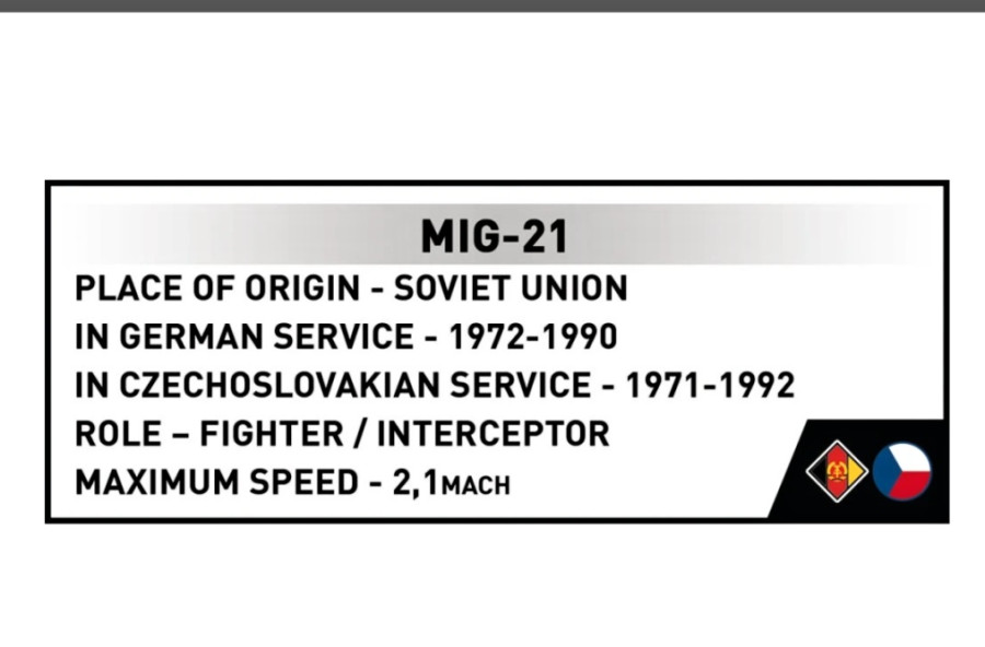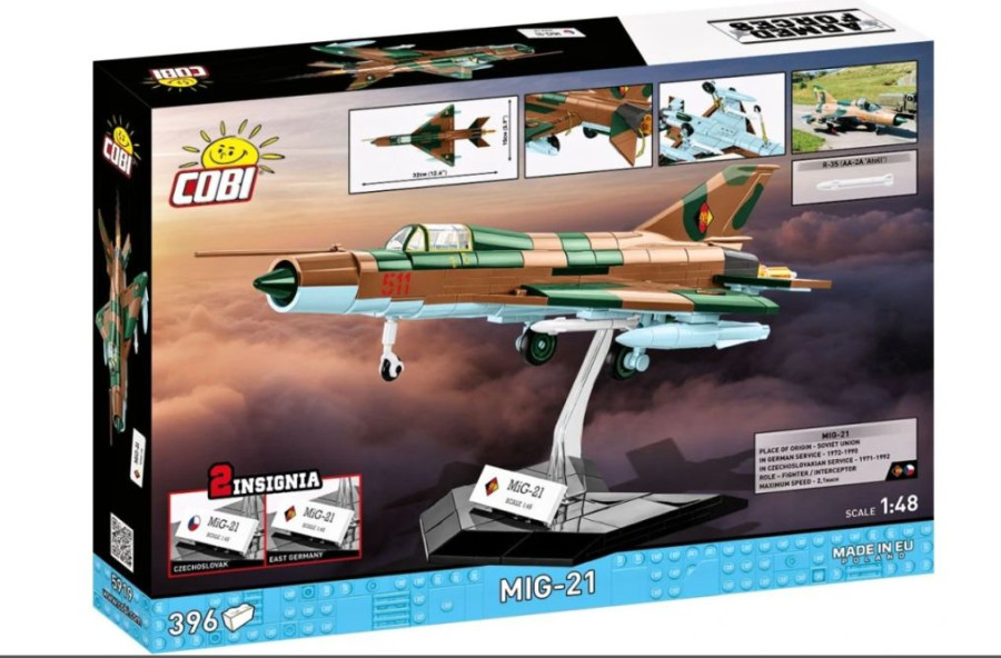 MiG-21 v barvách Československa nebo východního Německa od COBI! Ikona vojenského letectva studené války v modelu z kostek v měřítku 1:48.Přeneste se do časů studené války a postavte si stroj, který si vzbuzoval respekt na obou stranách železné opony. Stavebnice MiG-21 vám umožňuje znovu postavit stíhačku v barvách Československa nebo Německé demokratické republiky a zachytit ducha éry, kdy nadzvukové letouny definovaly globální rovnováhu sil.
