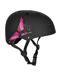 NILS Extreme MTW001 FLY je kvalitní helma typu „ořech“, navržená pro bezpečnou jízdu na kolečkových bruslích, skateboardu a koloběžce. Moderní černý matný design se symbolem křídel dodává helmě stylový vzhled.