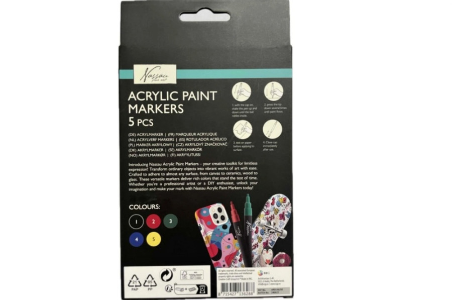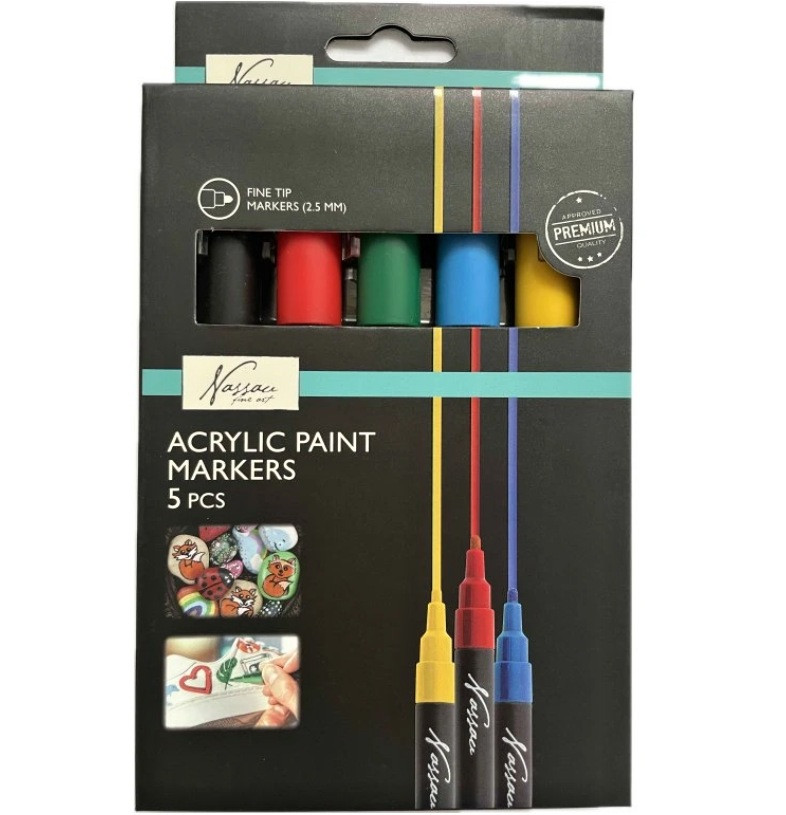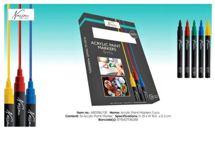 Balení obsahuje: 5 barev - černá, červená, žlutá, modrá, zelená - tloušťka hrotu 2,5 mm.