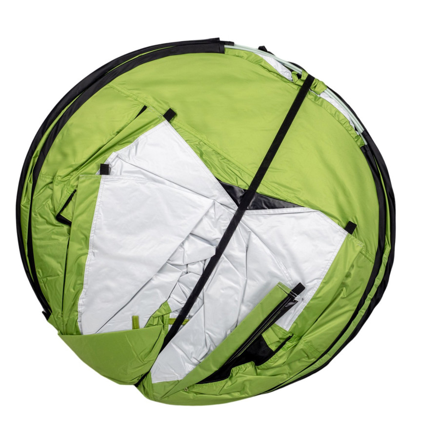 Díky samorozkládacímu systému 2 Seconds se stan po vyjmutí z obalu automaticky rozvine a během krátké chvíle je připraven k použití bez složité montáže konstrukce. Navléknuté sklolaminátové pruty drží stabilní tvar a umožňují velmi rychlou manipulaci při stavění i skládání.Velkou výhodou modelu je zatmavený vnitřní plášť v černém provedení, který omezuje pronikání ranního světla do interiéru a výrazně zvyšuje komfort při spaní během letních měsíců. Stan je určen pro 2 až 3 osoby a vnitřní rozměr 260 × 190 cm poskytuje dostatek prostoru pro pohodlné spaní i uložení základního vybavení. Maximální výška 115 cm umožňuje pohodlnější pohyb uvnitř při převlékání nebo organizaci věcí.Vrchní část stanu je vyrobena z 190T polyesteru s PU zátěrem 2000 mm, který spolehlivě chrání proti běžnému dešti a vlhkosti. Podlážka z 210D Oxford materiálu s PU zátěrem 3000 mm zajišťuje vyšší odolnost proti vlhkosti od země a lepší životnost při opakovaném používání. Konstrukce je vhodná pro běžné turistické využití a krátkodobé pobyty v přírodě.Stan je vybaven dvěma vstupy, oba vstupy mají integrovanou moskytiéru, která zajišťuje ochranu proti hmyzu a současně zlepšuje cirkulaci vzduchu uvnitř. Mechanické odvětrávání pomáhá snižovat kondenzaci vlhkosti během noci a zvyšuje celkový komfort při spaní v teplejším počasí.Nízká hmotnost kolem 2,8 kg umožňuje snadné přenášení a pohodlnou manipulaci při cestování autem i při kratším přenášení na místo nocování. Po složení má stan kompaktní kruhový transportní rozměr, který usnadňuje skladování i přepravu. Díky jednoduchému systému rozložení je vhodný i pro uživatele, kteří chtějí rychlé řešení bez složitého stavění.Hlavní výhody produktu: