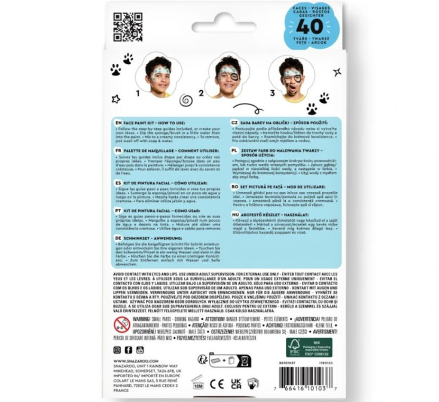 Snazaroo je osvědčená značka vodou ředitelných barev na obličej a tělo, vyráběných ve Velké Británii z hypoalergenních a dermatologicky testovaných ingrediencí. Barvy jsou vhodné i pro citlivou pokožku a byly navrženy tak, aby se snadno nanášely, dobře držely a přitom se daly jednoduše smýt pouze vodou a mýdlem.