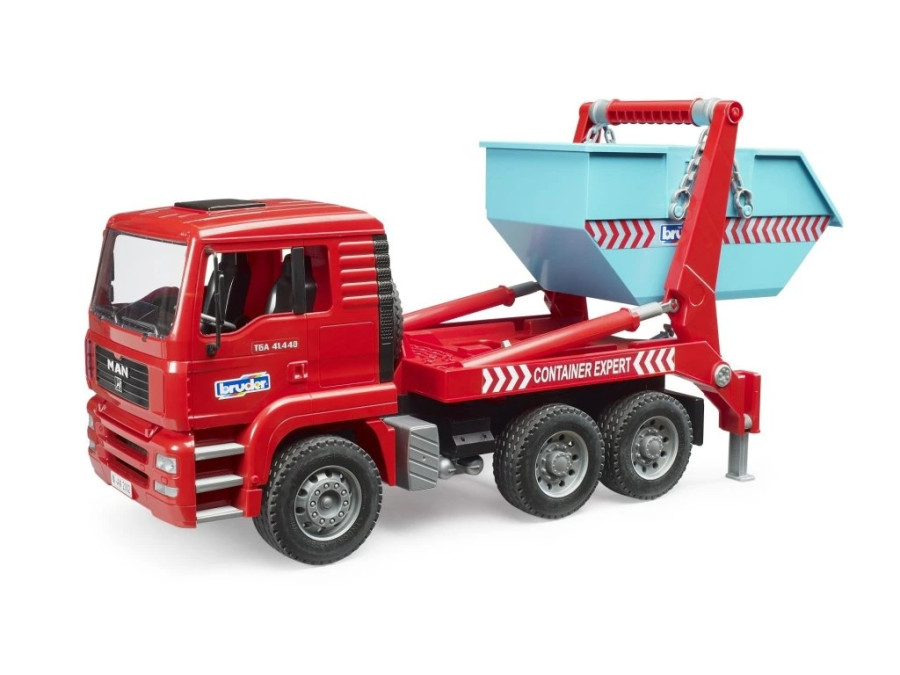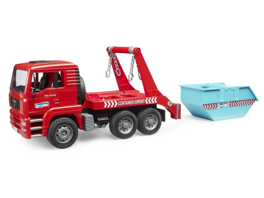 MAN TGA kontejnerové nákladní auto potkáte na stavbách i ve sběrných dvorech každý den, umožňují totiž naložit suť, zeminu nebo další materiál, který naložíte do kontejneru a přitom nezdržovat celý náklaďák. Kontejnerový vůz MAN TGA přenáší přesně tenhle princip do dětského světa hry: kontejner zvládnete naložit i složit jedním pohybem, po odejmutí řetězů může zůstat stát na místě a vůz je hned připravený na další jízdu.Pro stabilní manipulaci jsou na podvozku vysouvací podpěry a nechybí ani typická sklopná kabina, díky které je vidět na motorový blok. Ovládání zdvihu a vysypávání probíhá ruční pákou, takže děti mají celý proces krásně pod kontrolou.Vlastnosti hračky: