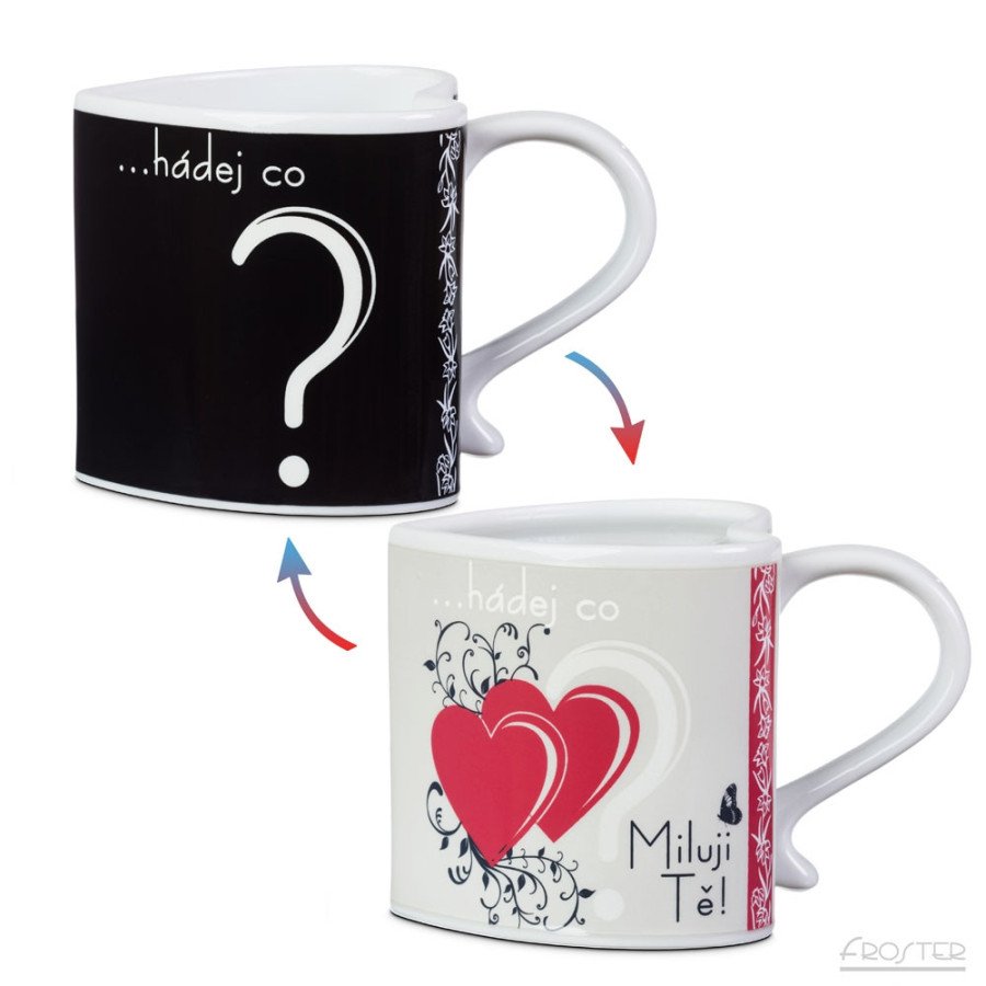 Kouzelný hrnek byl pokryt speciální barvou, která po zahřátí postupně mění svůj vzhled. Po vychladnutí nebo zalití studenou vodou se hrnek vrátí do původní podoby.Na rozdíl od většiny hrnků citlivých na teplo se tento hrnek kompletně promění.Celoplošný potisk. Nápis na výrobku: Hádej co? Miluji tě! Výrobek v české jazykové verzi.Materiál: porcelán. Rozměry: 8,5 cm (výška), 300 ml (objem). Vhodné pro styk s potravinami.Výrobek je chráněn registrovanou ochrannou známkou.Bezpečný výrobek - certifikováno hygienickou inspekcí.UPOZORNĚNÍ: