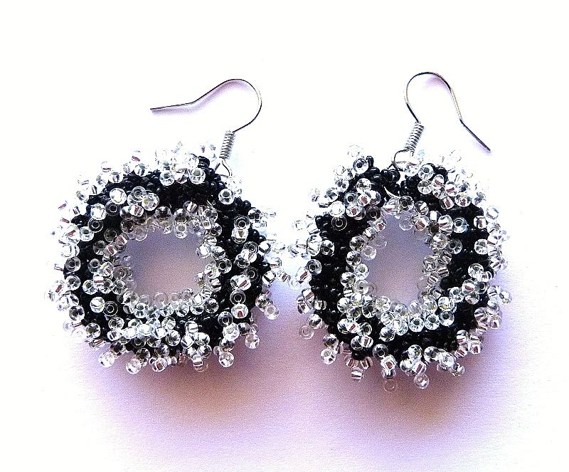 Náušnice Stříbrno - černé kruhy jsou ručně šité kruhy z černého a stříbrného rokajlu.