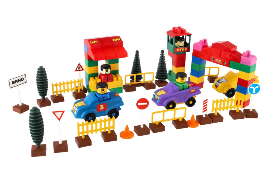 Balení satevbnice obsahuje základní kostky, autíčka, značky, panáčci, stromečky a samolepky. Stavebnice je balena v papírové krabičce.Velikost dílků kostek začíná rozměrem 3 x 3 cm. Stavebnice je vyrobena v ČR.