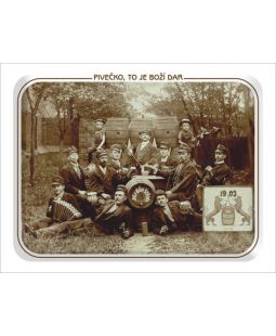 Plechová historická pivovarská bombírovaná cedule o velikosti 420 x 297 mm s motivvem  propagačního plakátu, který propagoval České pivo.