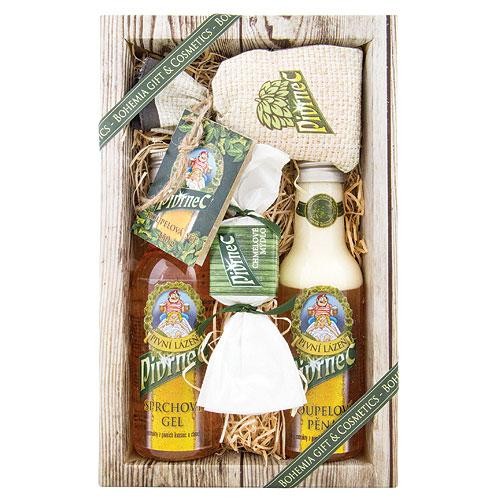 Dárkové balení pivní kosmetiky (Pivrnec) obsahuje sprchový gel 200 ml., toaletní mýdlo 30 g., koupelová pěna 200 ml. a koupelová sůl 150 g. Sada obsahující extrakty z pivních kvasnic a chmele má hydratační účinky k vaší pokožce.