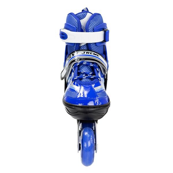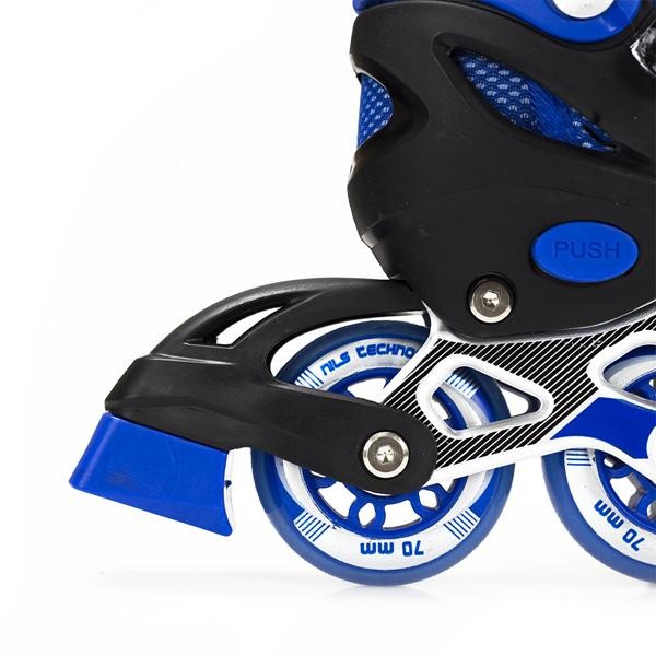 Kolečkové brusle Nils Extreme NAJ1828 A sloužící k rekreační jízdě pro začátečníky a mírně pokročilé. Lehká a odolná bota zajišťuje bezpečnost při jízdě. Systém ventilace a tvarovaná stélka boty přímo ovlivňují zvýšení uživatelského komfortu. Jedná se o model s nastavitelnou velikostí, kdy každá brusle má na výběr z 4 rozměrů. Pomocí jednoduchého řídicího systému lze snadno a rychle nastavit velikost boty na noze uživatele