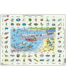 Dětské deskové puzzle s motivem obrázku u moře pro výuku Angličtiny s anglickými výrazy, obsahující 70 dílků. Toto puzzle je na pevném papírovém kartonu a nemá klasické puzzlové dílky. Jednotlivé dílky se skládají přímo na přiloženou podložku s rámečkem.
