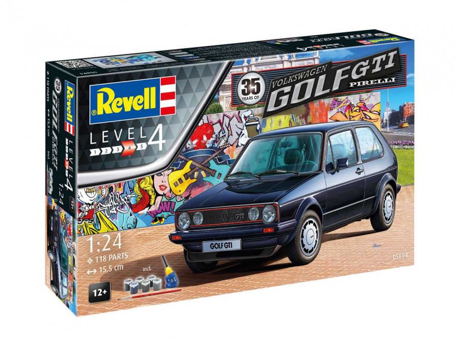 Revell Gift auto 05694, 35 Years VW Golf 1 GTi Pirelli je plastiková stavebnice k 35. výročí automobilu VW Golf GTI.
