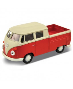 Kovový model auta Volkswagen T1 Double Cabin Pick Up červené barvy v měřítku 1:34 značky Welly. Model autíčka má kovové osy kol a detailní zpracování karoserie včetně interiéru automobilu. Na modelu se otvírají dveře.