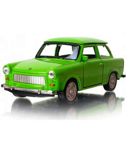 Kovový model auta Trabant 601 v zelené barvě a měřítku 1:34/39 značky Welly. Model autíčka má kovové osy kol a detailní zpracování karoserie včetně interiéru automobilu. Na modelu se otvírají dveře.