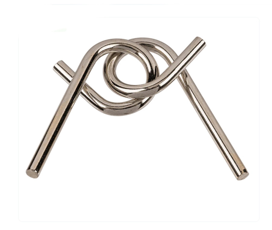 Kovový hlavolam dvojitý uzel v retro krabičce má středně těžkou obtížnost a jeho balení obsahuje návod jak odělit od sebe jeho části bez použití násilí.