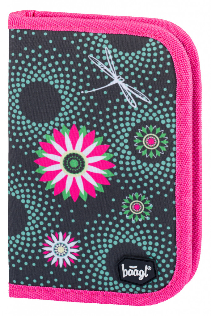 Zelený klasický jednochlopňový holčičí penál na zip Baagl klasik Květiny na zip. Tento penál poskytuje dostatek prostoru pro všechny psací pomůcky.