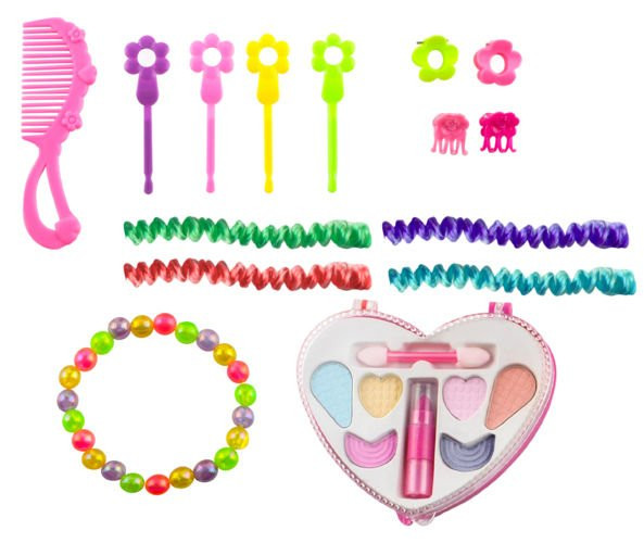 Sada obsahuje hlavu se svěžími vlasy, kartáč, sponky do vlasů a gumové pásky a další doplňky.