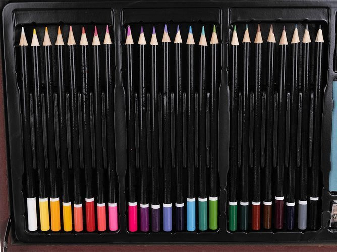 Kreativní sada obsahuje mnoho prvků, včetně: 60 voskovek, 24 pastelů, 24 barevných tužek, 24 vodových barev, plus 2 štětce, ořezávátko, 2 kousky brusného papíru, gumu, dvě tužky HB a 2B.