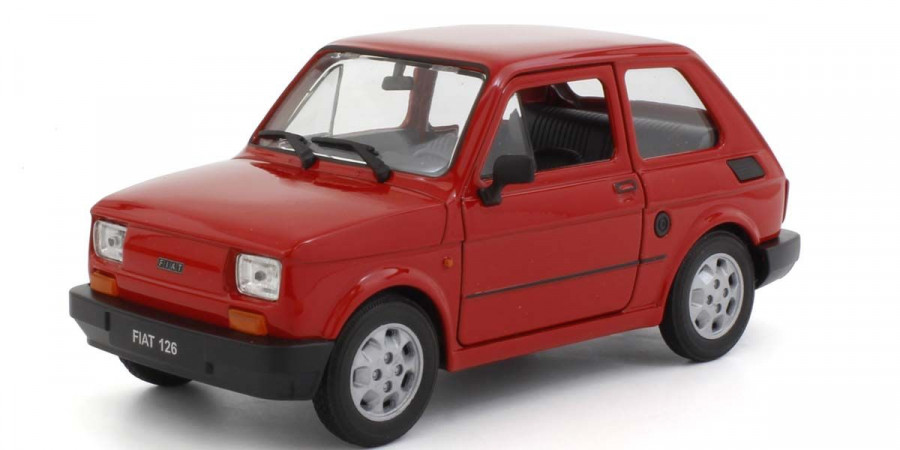 Kovový model legendárního auta Fiat 126 (Maluch) v měřítku 1:21 značky Welly. Model auta má otevírací dveře, otevírací kapota motoru, natáčecí přední kolečka a detailní zpracování karoserie včetně interiéru automobilu.