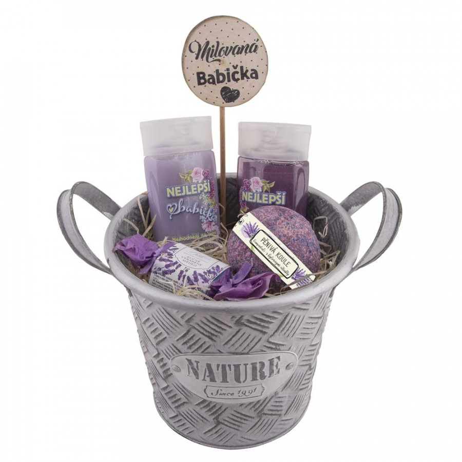 Dárkový plechový box pro milovanou babičku obsahuje kosmetiku s vůní levandule, praktický box a dřevěné zapichovátko do květináče. Dárek babičce k narozeninám, svátku nebo Vánocům.