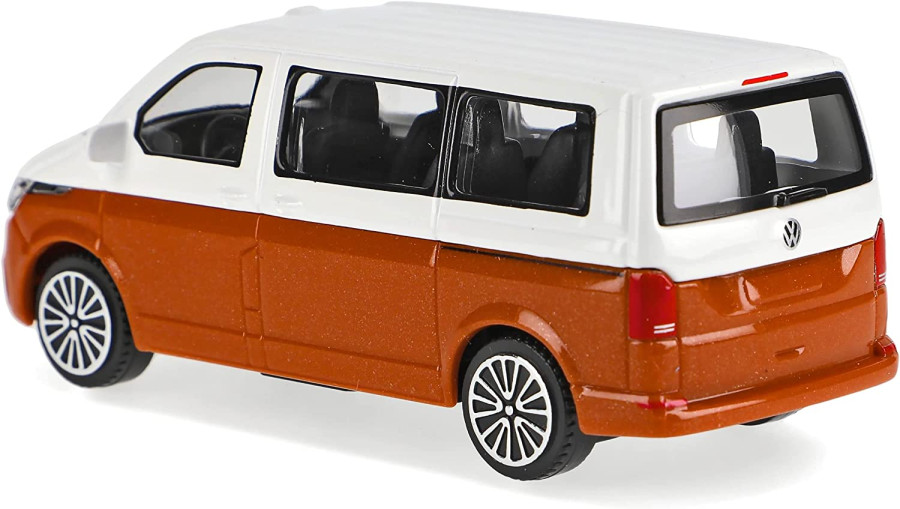 Kovový model aut Bburago VW T6.1 bus 2020 v bílooranžové barvě a měřítku 1:43. Autíčko je vyrobeno z kovu a má kovové osy kol s plastovým podvozkem.