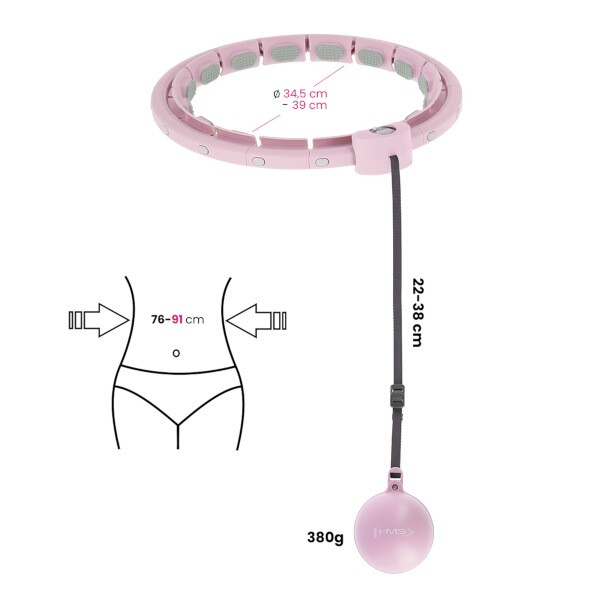 HMS HHW09 je hula hoop obruč s nastavitelnou délkou, masážními výstupky a rotujícím závažím. Funkce obruče HMS HHW09 je velice jednoduchá. Konstrukce se skládá z 16 stejných dílů které se do sebe skládají. Aby šla obruč uzavřít, tak je potřeba použít nejméně 14 kusů, které následně vytvoří kruh o vnitřním průměru 34,5 centimetrů, pokud spojíte všech 16 kusů, pak bude vnitřní průměr 39 centimetrů. Model HHW09 je vhodný pro obvod pasu od 76-ti do 91 centimetrů. Jednotlivé díly v sobě skrývají kolejnici, do které se před uzavřením zasune kotva s počítadlem, která je osazena čtyřmi kuličkovými ložisky. Displej počítadla zobrazuje počet obkroužení obruče kotvou. Ke kotvě je, pomocí délkově nastavitelného provázku, připojeno závaží o hmotnosti 380 gramů. Provázek lze nastavit na délku 22 až 38 centimetrů, změnou délky provázku se nastavuje výsledná odstředivá síla závaží - čím delší provázek, tím "těžší" bude závaží. Délka obruče se nastaví podle obvodu pasu tak, aby byla dostatečně volná, ale zároveň aby nepadala přes boky. Po nastavení délky se obruč uzamkne pomocí spojovacího dílu, který je osazen páčkou pro ovládání zámku. Závaží se následně "vrhne" směrem, do kterého budeme kroutit boky a začneme trénink. Obruč HHW09 je z vnitřní strany opatřena masážními výstupky s pružinami, které tlumí vibrace od pohybující se kotvy a zároveň příjemně masírují oblast pasu. Intensitu tréninku ovlivňuje délka provázku a rychlost, jakou kroutíme boky. Pravidelné používání HMS HHW09 dokáže zeštíhlit břicho a pas, kroucení boky redukuje tukové tkáně stehen a hýždí. 30 minut tréninku dokáže nahradit až hodinu plavání a nebo 3 hodiny běhu. Jednotlivé díly obruče jsou vyrobeny z kvalitního PVC, závaží je potaženo gumou a naplněno pískem.