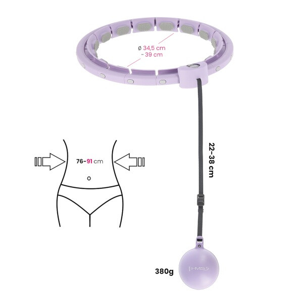 HMS HHW09 je hula hoop obruč s nastavitelnou délkou, masážními výstupky a rotujícím závažím. Funkce obruče HMS HHW09 je velice jednoduchá. Konstrukce se skládá z 16 stejných dílů které se do sebe skládají. Aby šla obruč uzavřít, tak je potřeba použít nejméně 14 kusů, které následně vytvoří kruh o vnitřním průměru 34,5 centimetrů, pokud spojíte všech 16 kusů, pak bude vnitřní průměr 39 centimetrů. Model HHW09 je vhodný pro obvod pasu od 76-ti do 91 centimetrů. Jednotlivé díly v sobě skrývají kolejnici, do které se před uzavřením zasune kotva s počítadlem, která je osazena čtyřmi kuličkovými ložisky. Displej počítadla zobrazuje počet obkroužení obruče kotvou. Ke kotvě je, pomocí délkově nastavitelného provázku, připojeno závaží o hmotnosti 380 gramů. Provázek lze nastavit na délku 22 až 38 centimetrů, změnou délky provázku se nastavuje výsledná odstředivá síla závaží - čím delší provázek, tím "těžší" bude závaží. Délka obruče se nastaví podle obvodu pasu tak, aby byla dostatečně volná, ale zároveň aby nepadala přes boky. Po nastavení délky se obruč uzamkne pomocí spojovacího dílu, který je osazen páčkou pro ovládání zámku. Závaží se následně "vrhne" směrem, do kterého budeme kroutit boky a začneme trénink. Obruč HHW09 je z vnitřní strany opatřena masážními výstupky s pružinami, které tlumí vibrace od pohybující se kotvy a zároveň příjemně masírují oblast pasu. Intensitu tréninku ovlivňuje délka provázku a rychlost, jakou kroutíme boky. Pravidelné používání HMS HHW09 dokáže zeštíhlit břicho a pas, kroucení boky redukuje tukové tkáně stehen a hýždí. 30 minut tréninku dokáže nahradit až hodinu plavání a nebo 3 hodiny běhu. Jednotlivé díly obruče jsou vyrobeny z kvalitního PVC, závaží je potaženo gumou a naplněno pískem.