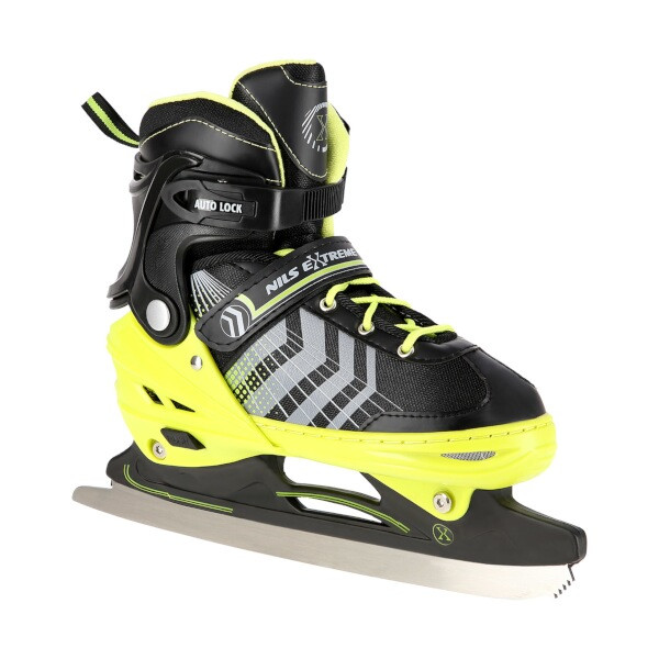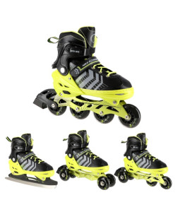 NILS Extreme NH18192 jsou kolečkové brusle 4v1 s vyměnitelným nožem na led, které jsou určeny pro začínající a středně pokročilé uživatele. Hliníkový podvozek je osazen měkkými PU kolečky s ložisky ABEC7 pro svižnou jízdu. Vnější bota je pomocí stisku tlačítka nastavitelná do čtyř velikostí, toto řešení umožňuje precizní přizpůsobení velikosti podle aktuálních potřeb anebo se používá jako "rostoucí bota", která "roste" spolu s nohou dítěte. Na špičce jsou ventilační otvory pro maximální prodyšnost. Vnitřní bota je vyrobena z kombinace semiše, síťoviny MESH, EVA a pěny o vysoké hustotě. Zapínání je řešenou klasickou trojkombinací - šněrování, řemínek se suchým zipem a dvousekční přezka. Součástí balení je sada šroubů a podložek pro přestavbu podvozku do konfigurace 2+1 a 2+2 a pár nožů na led, které jsou vyrobeny z nerez oceli s vysokým podílem uhlíku.