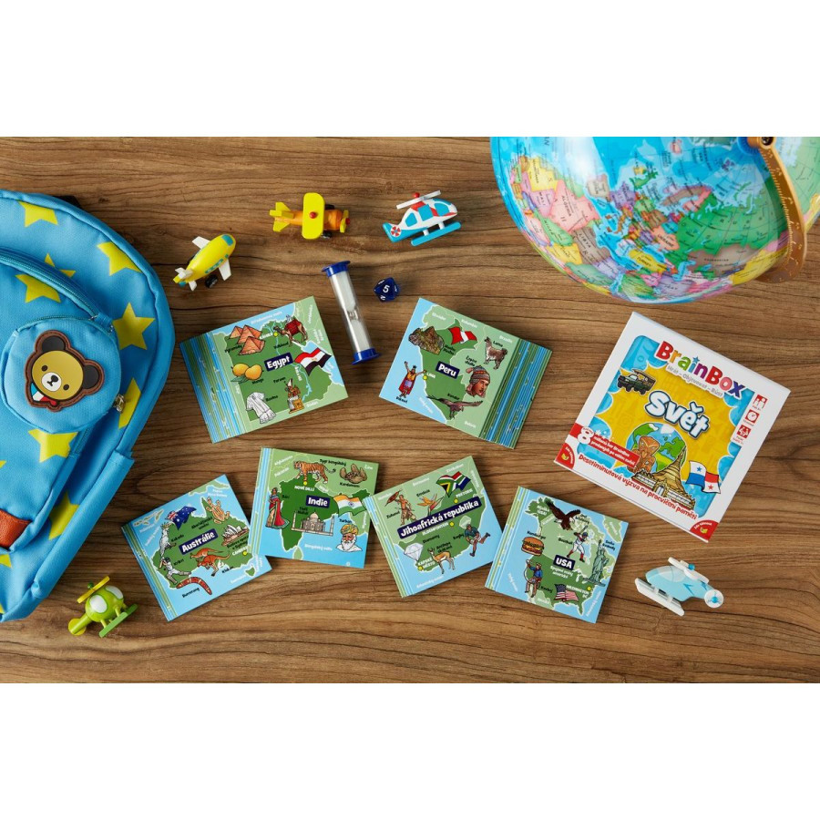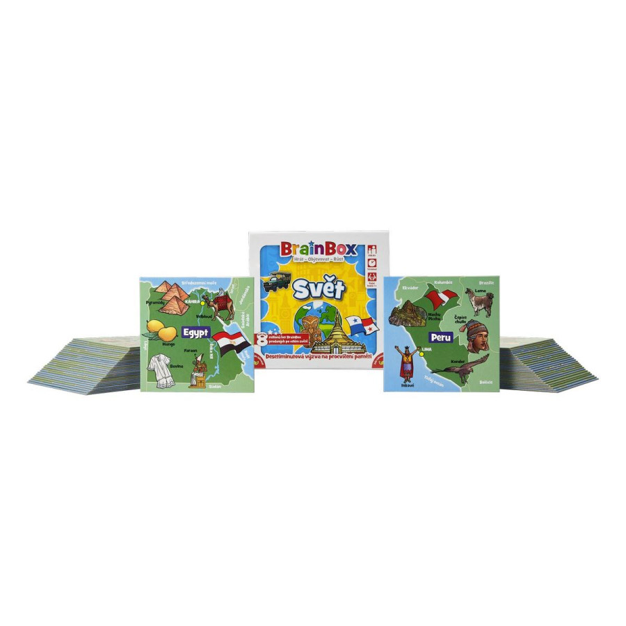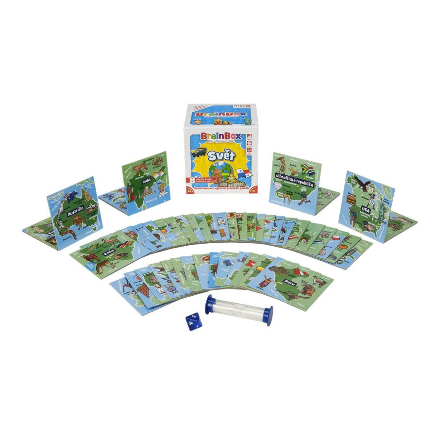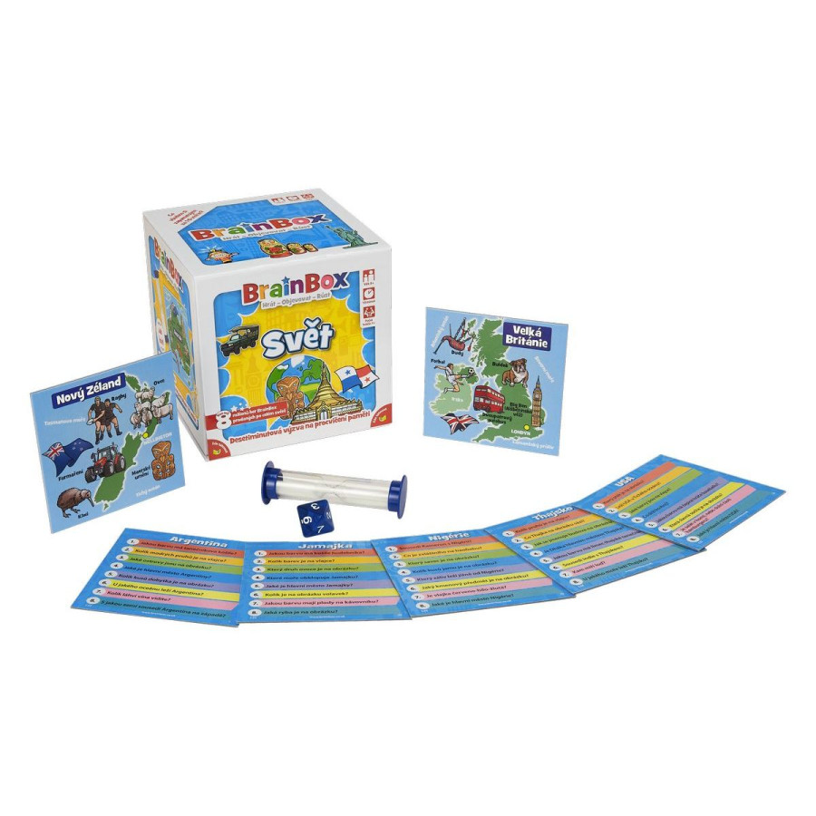 Edice hry věnovaná světu vyzkouší vaše znalosti zemí celého světa - jak dobře znáte obyvatele, kulturu, a to nezajímavější a nejtypičtější pro dané země?BrainBox Svět obsahuje 55 hracích karet s nejrůznějšími zeměmi: od Velké Británie po USA, od Řecka po Ghanu, od Thajska po Mexiko a tak dále. Na každé kartě je mapa země s vyznačeným hlavním městem a ručně malovanými obrázky toho nejzajímavějšího, co je pro danou zemi typické.Hra pomáhá dětem dozvědět se více o světě, a přitom rozvíjí kognitivní dovednosti, jako je postřeh a vybavování vzpomínek, které tvoří základ pro učení na celý život.Jak na hru?1. Vezměte si libovolnou kartičku z krabice2. Během 10 vteřin si zapamatujte co nejvíce z její obrázkové strany 3. Hoďte kostkou4. Odpovězte na otázkuObsah balení: 55 karet, pravidla, 1 přesýpací hodiny, 1 kostka