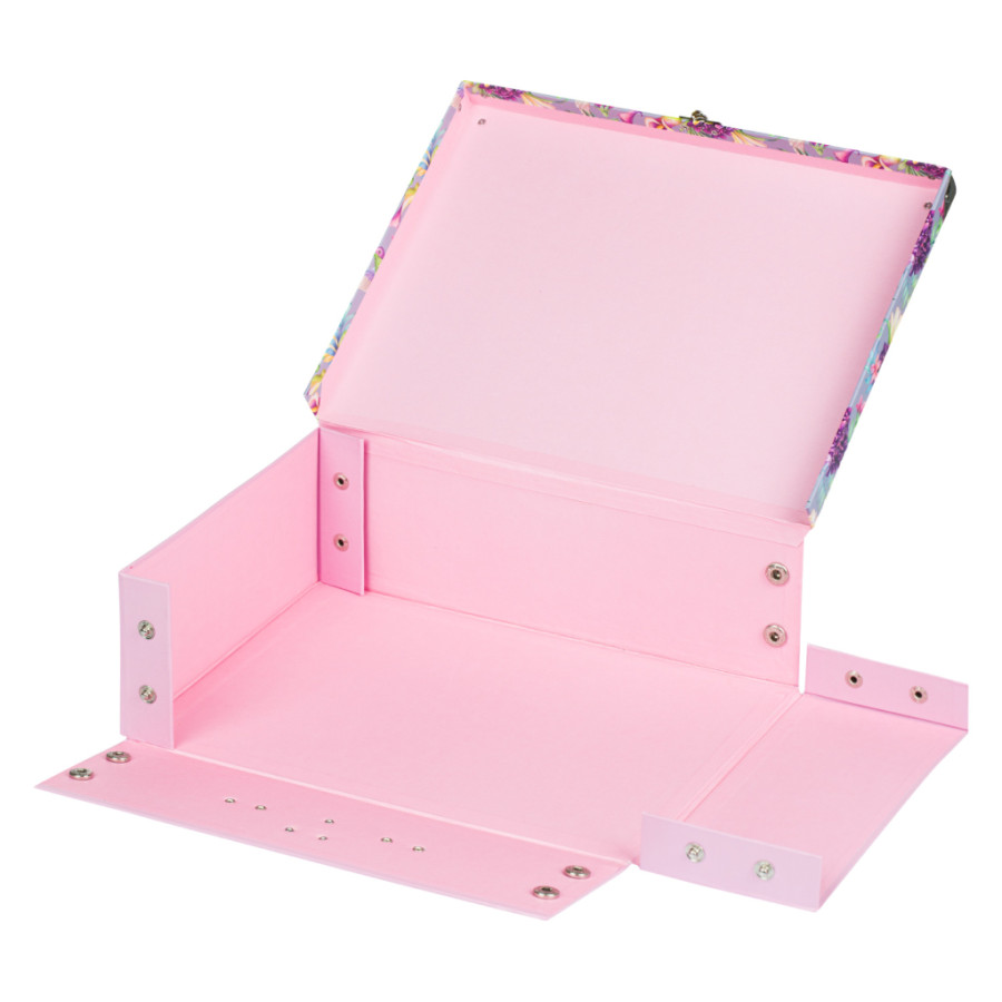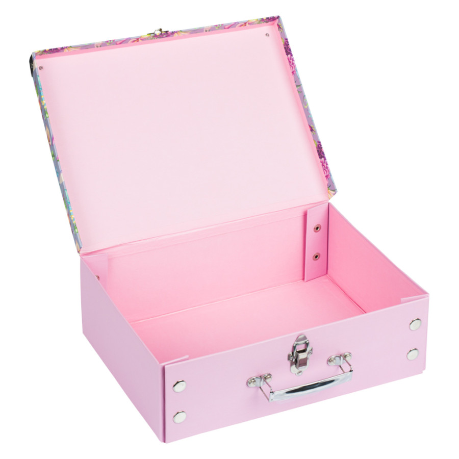 Skládací kufřík z pevného laminovaného papíru s okovanými rohy. Unikátní provedení s patentky, díky nimž se dají vždy znovu složit a rozložit. Opatřené kovovým uchem a uzavíratelné na klasickou přezku.