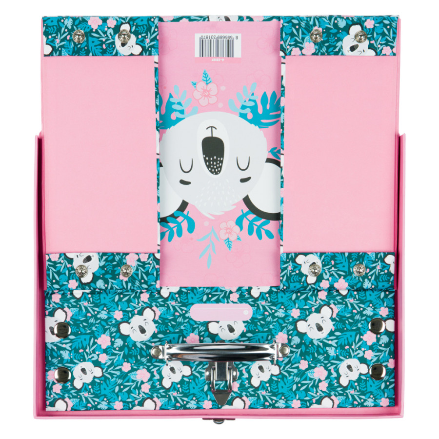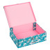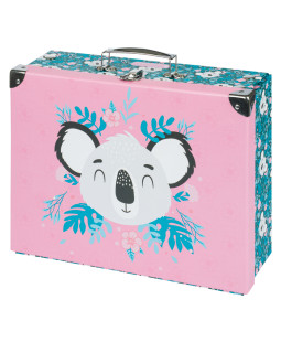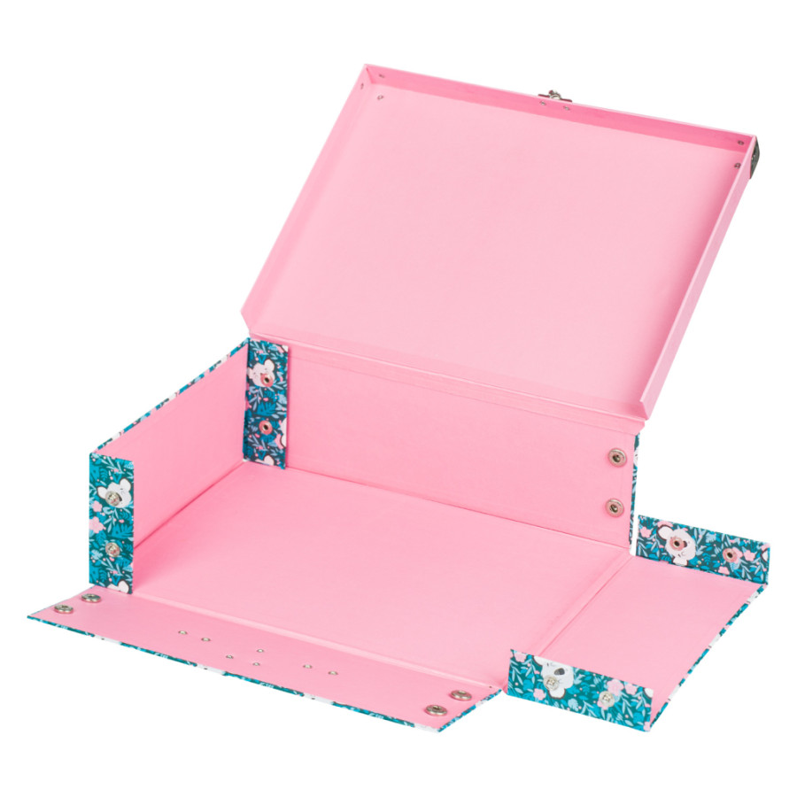 Skládací kufřík z pevného laminovaného papíru s okovanými rohy. Unikátní provedení s patentky, díky nimž se dají vždy znovu složit a rozložit. Opatřené kovovým uchem a uzavíratelné na klasickou přezku.