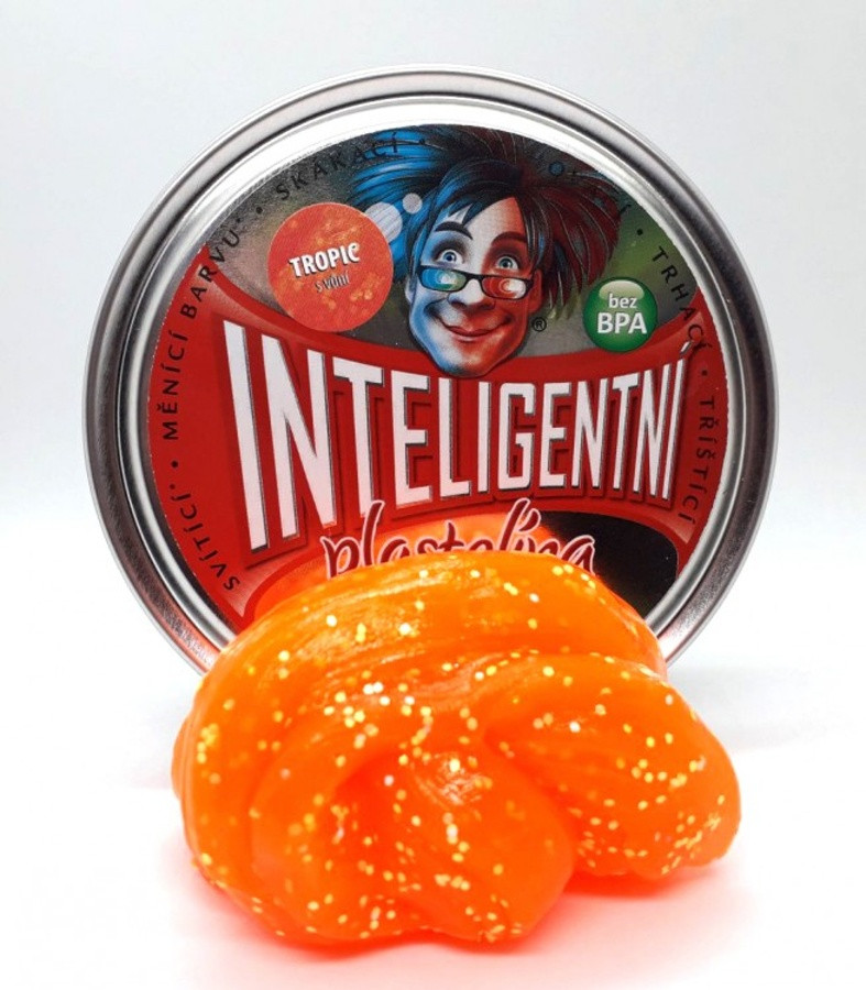 Inteligentní plastelína Tropic je nejlepší antistres. Když plechovku otevřete, budete překvapeni jejím zářivě oranžovým vzhledem se zlatožlutými třpytkami a lehkou pomerančovou vůní.