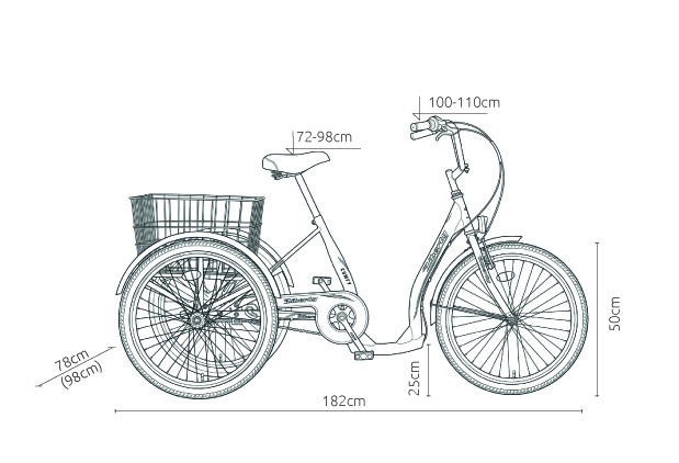 Dále má tříkola 3 rychlostní zadní náboj Shimano Nexus s řazením na řídítkách a protišlapnou zadní brzdou. Šířka zadní nápravy je 760 mm. Součásti jsou výškově nastavitelná řídítka, přední brzda V-Brake, dvojité ráfky kol, LED bateriové osvětlení, kompletní výbava pro provoz na pozemních komunikacích.