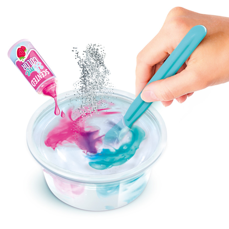 Obsah: sušák, míchátko, průhledný sliz, 2 barvy s vůní ananasu a jahod a třpytky.