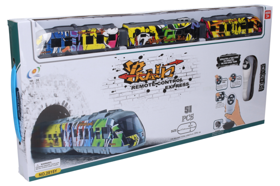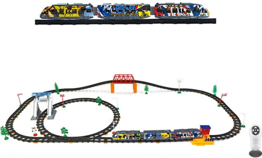 Cool vlak pokrytý grafitti je připravený vyrazit na cestu. Součástí setu je mašinka, 2 vagóny, koleje, ovladač s přísavkou, stanice, výhybka, stromy, značky. Délka trati 374 cm.