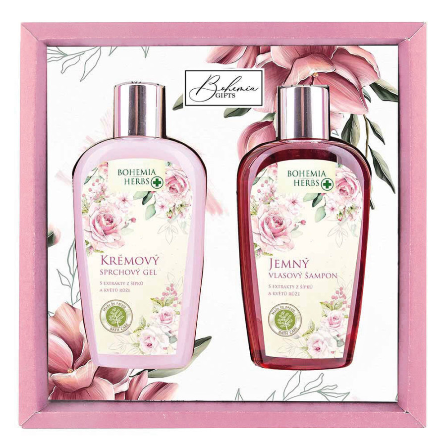 Dárková sada kosmetiky pro ženy s extrakty z šípků a růže obsahuje sprchový gel 250 ml a vlasový šampon 250 ml. Kosmetika je obohacena o kosmetický olivový olej a kvalitní extrakty z plodů šípku a květů růže.